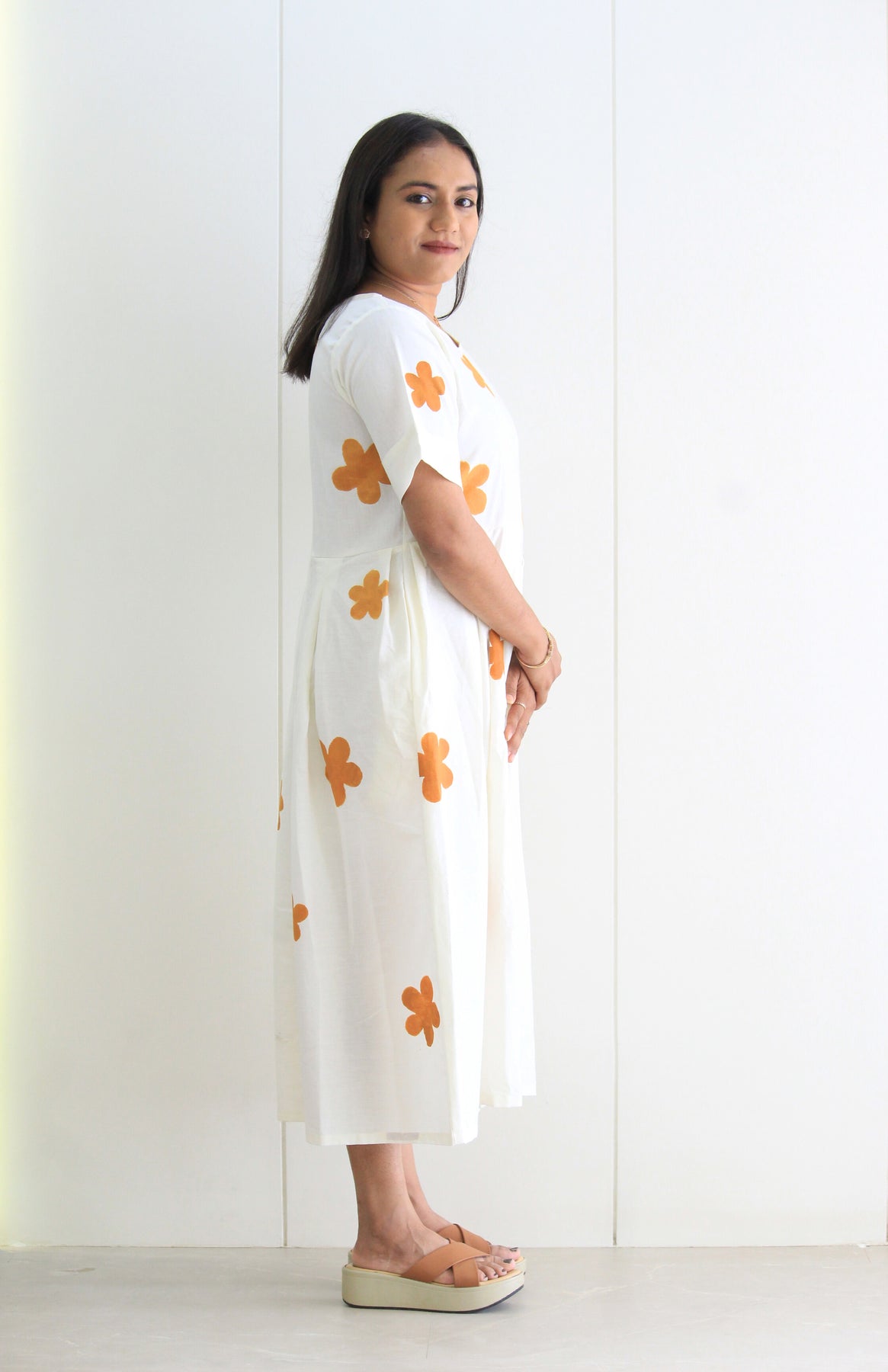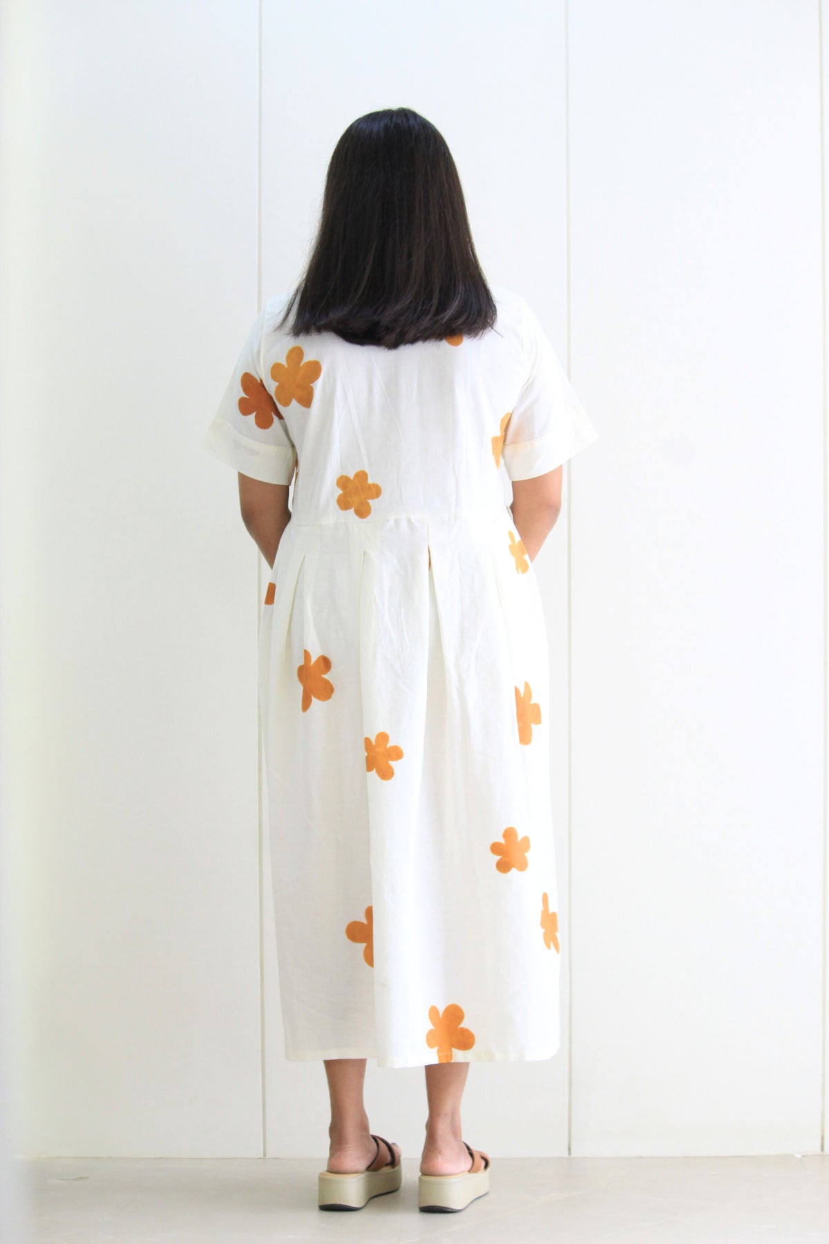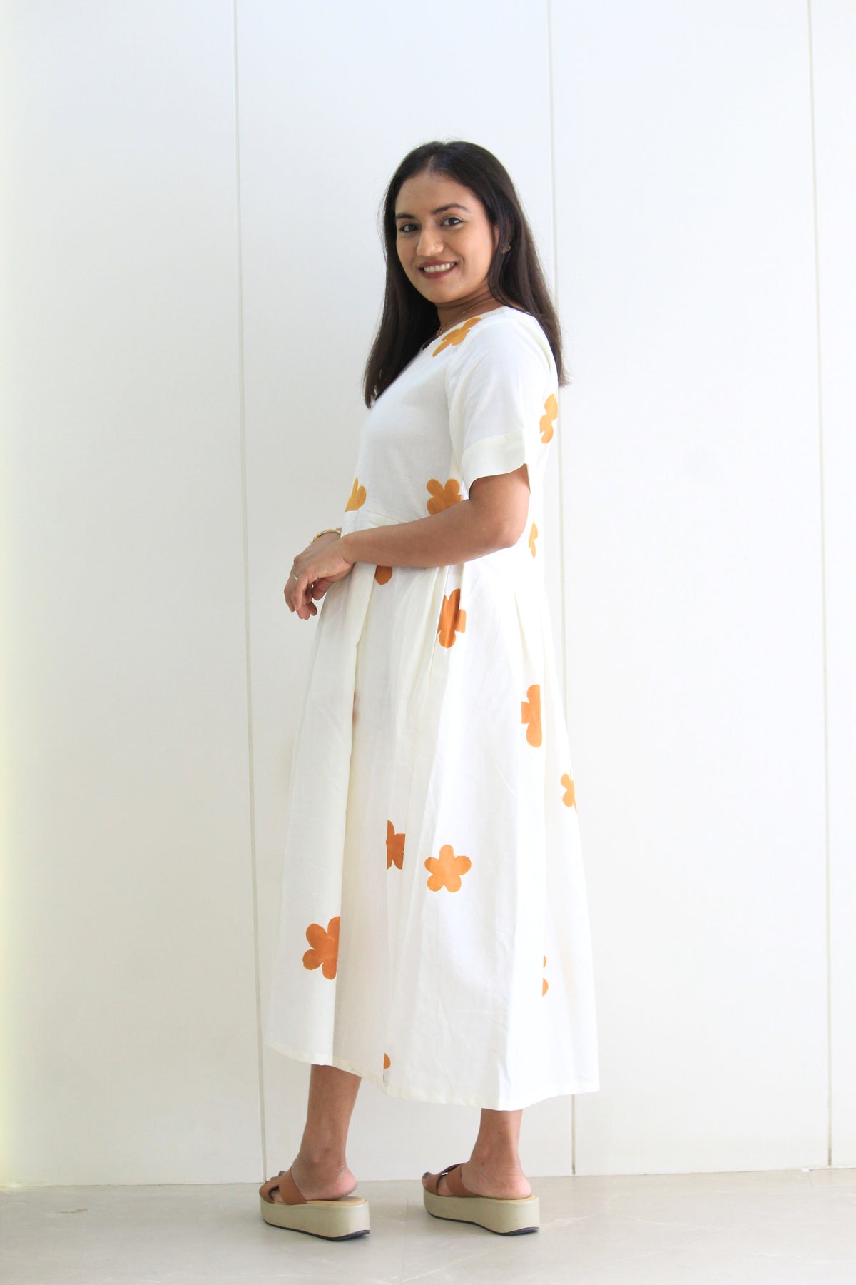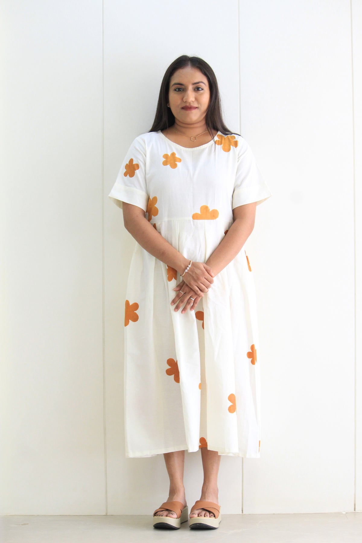 Anaya – White & Marigold Floral Hand Printed Cotton Dress