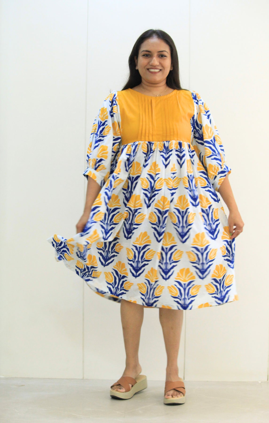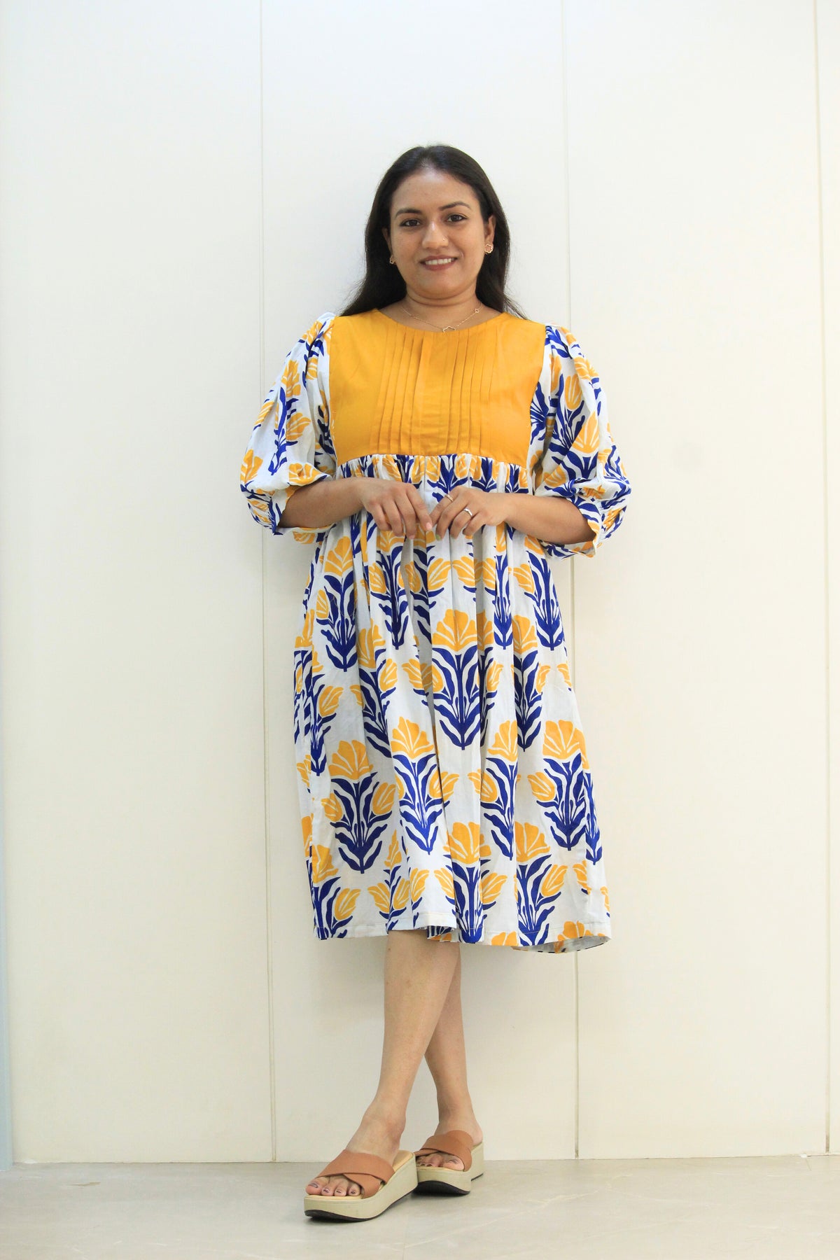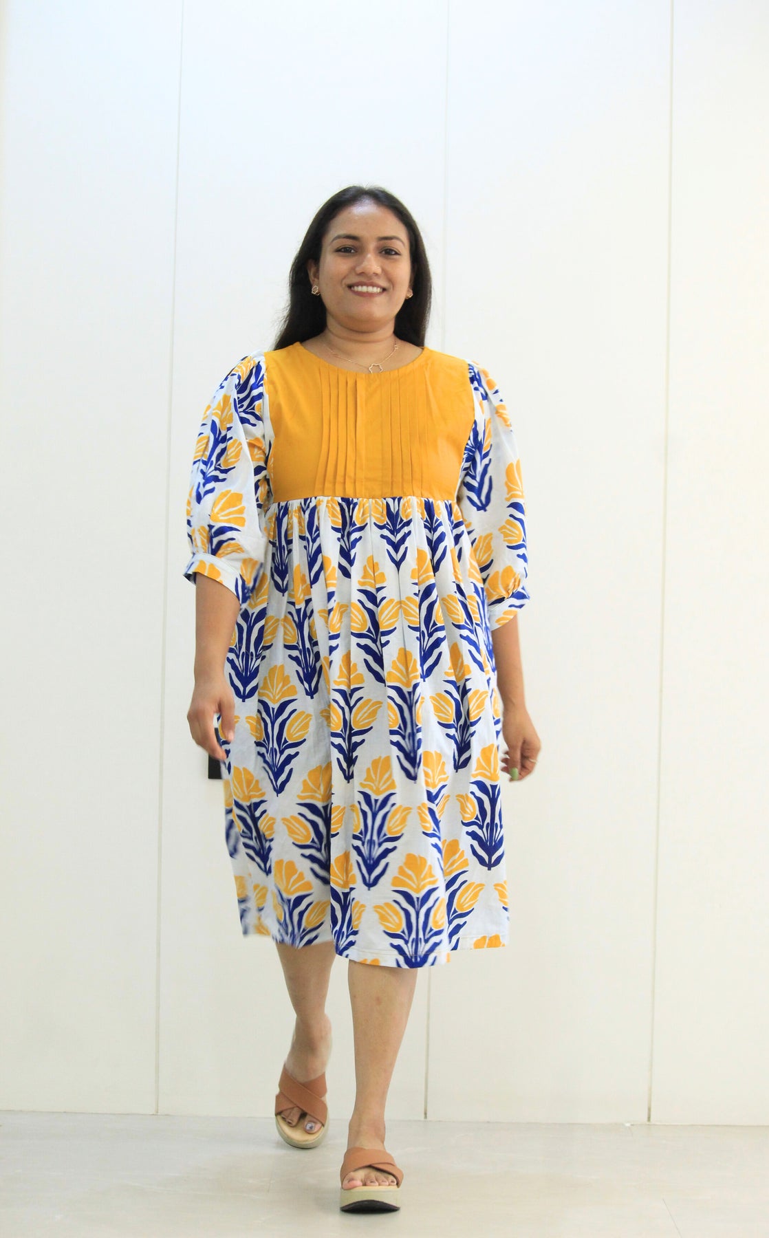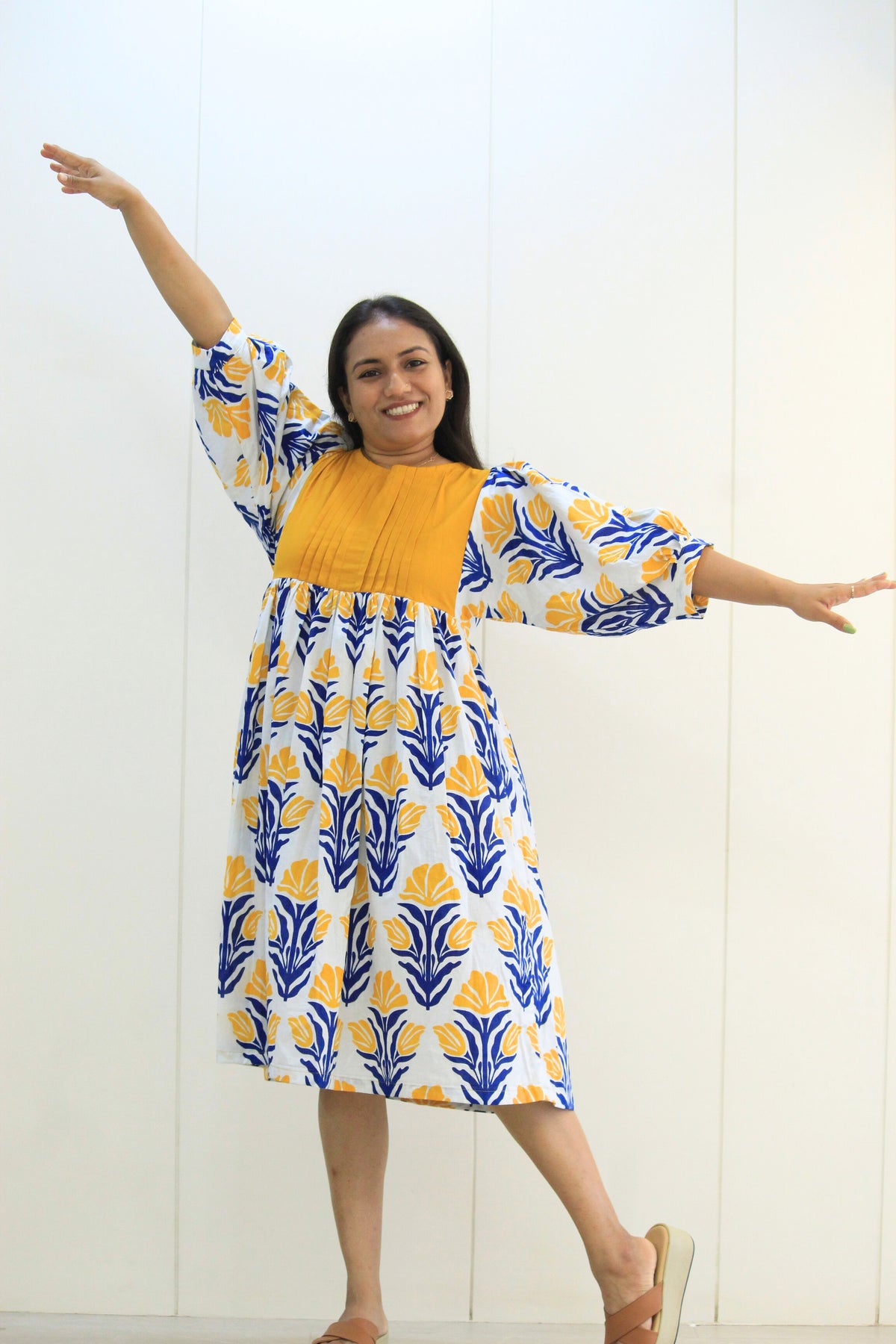 The Kanika dress brings together comfort and color in the best way. With its mustard yellow pleated yoke and playful blue-yellow floral print, it’s designed to lift your mood and brighten your day—whether you’re heading out or just relaxing at home.