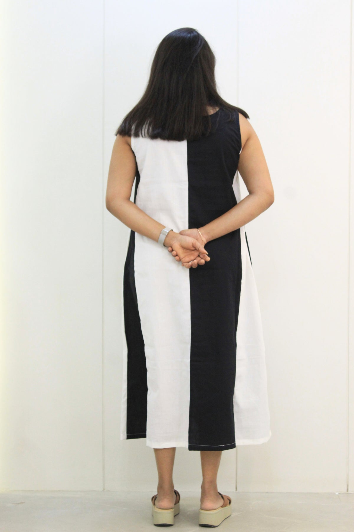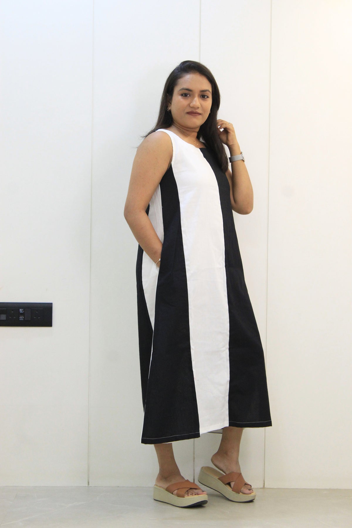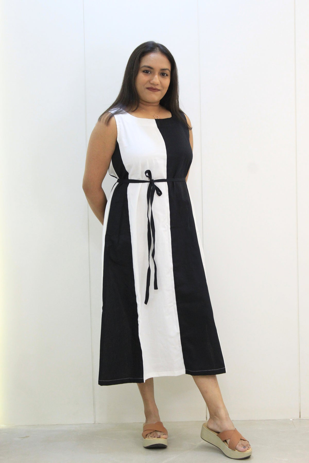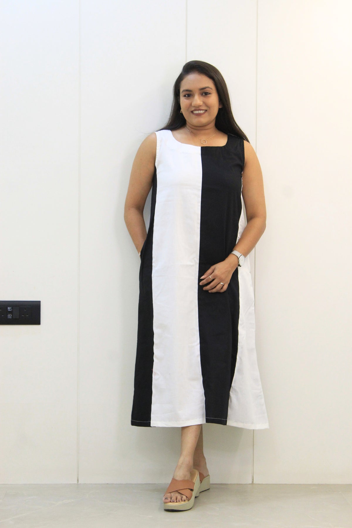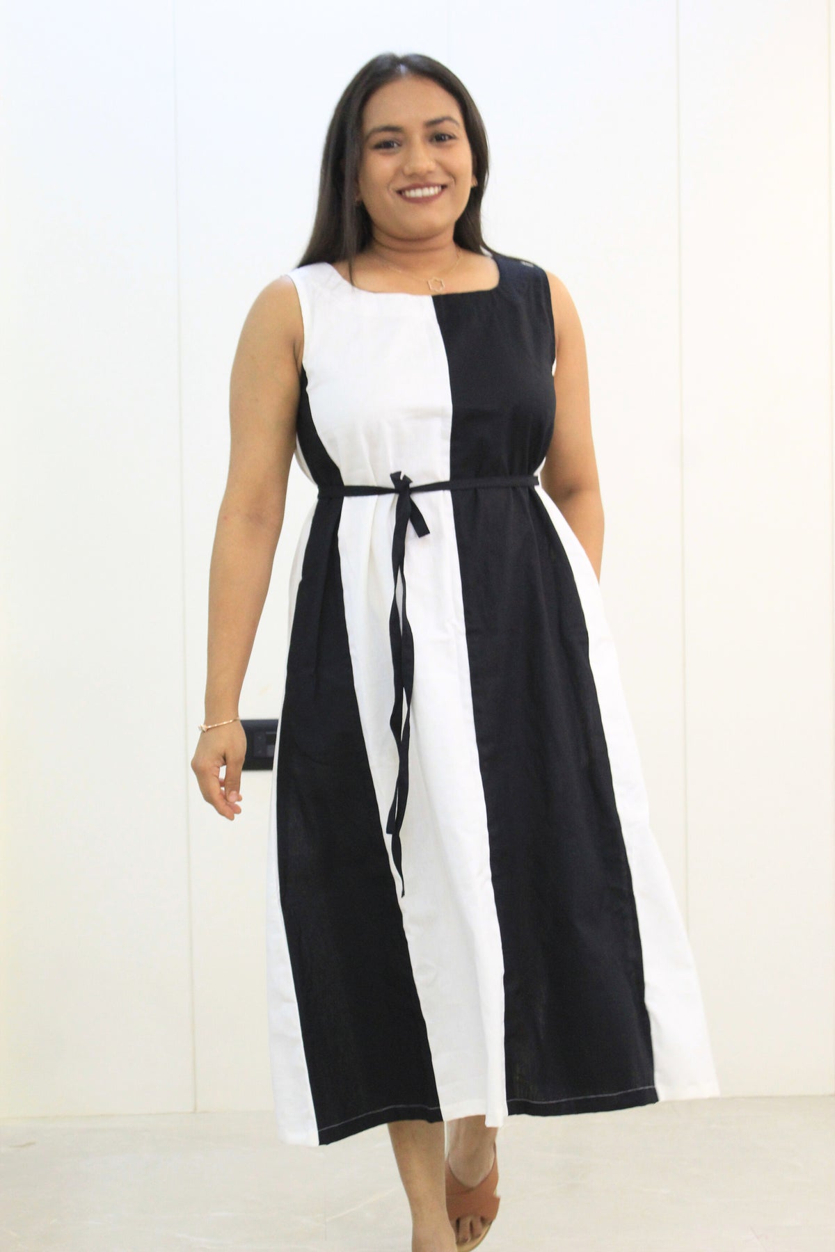 The Madhubala dress is all about balance — with bold black and white panels and a soft cotton feel. It comes with a side tie to adjust your fit and makes everyday dressing feel easy and stylish.