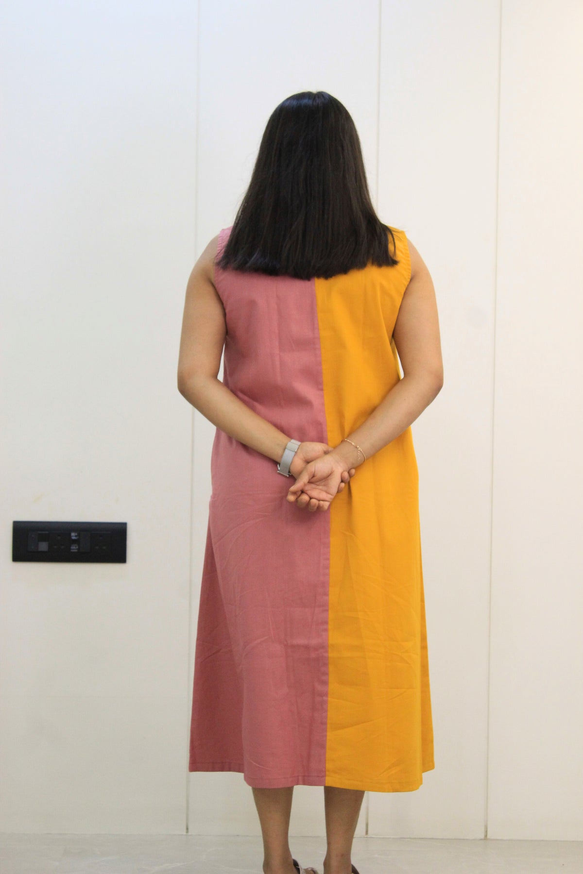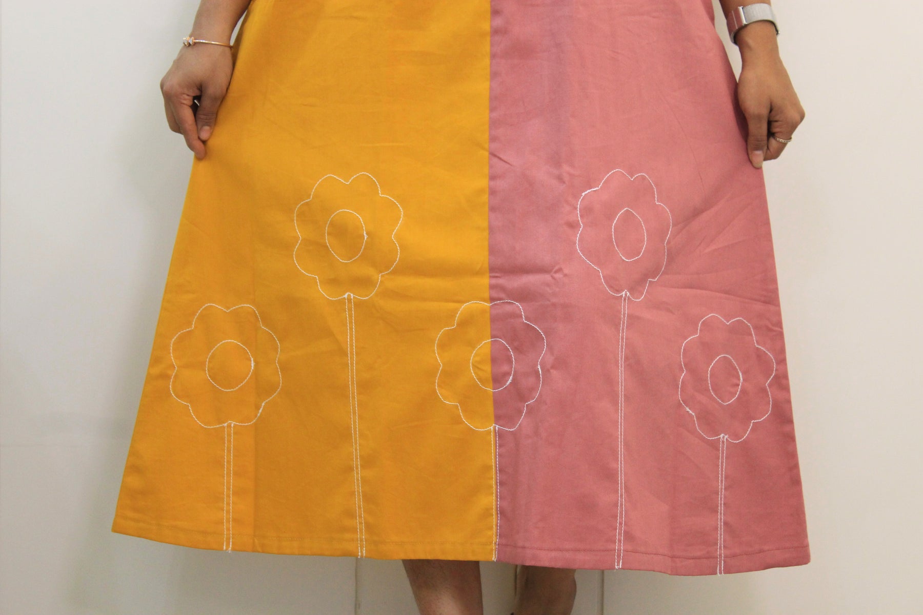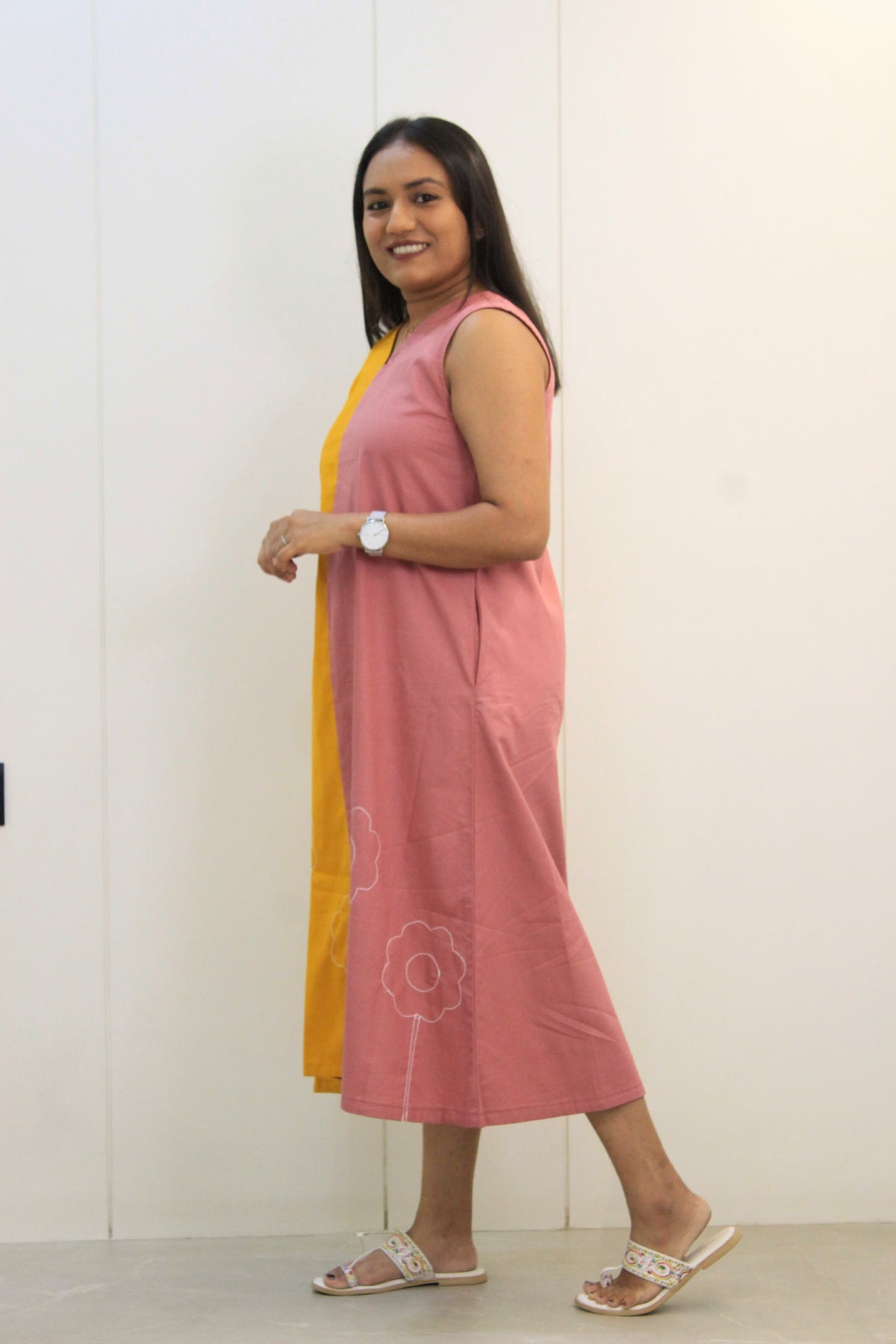 The Mohini dress brings joy to your wardrobe with a soft color-block canvas of mustard yellow and dusty rose. With delicate floral thread embroidery blooming across the hemline, this sleeveless A-line midi is a burst of cheerful charm and cottony comfort — made for slow days and sunshine strolls.