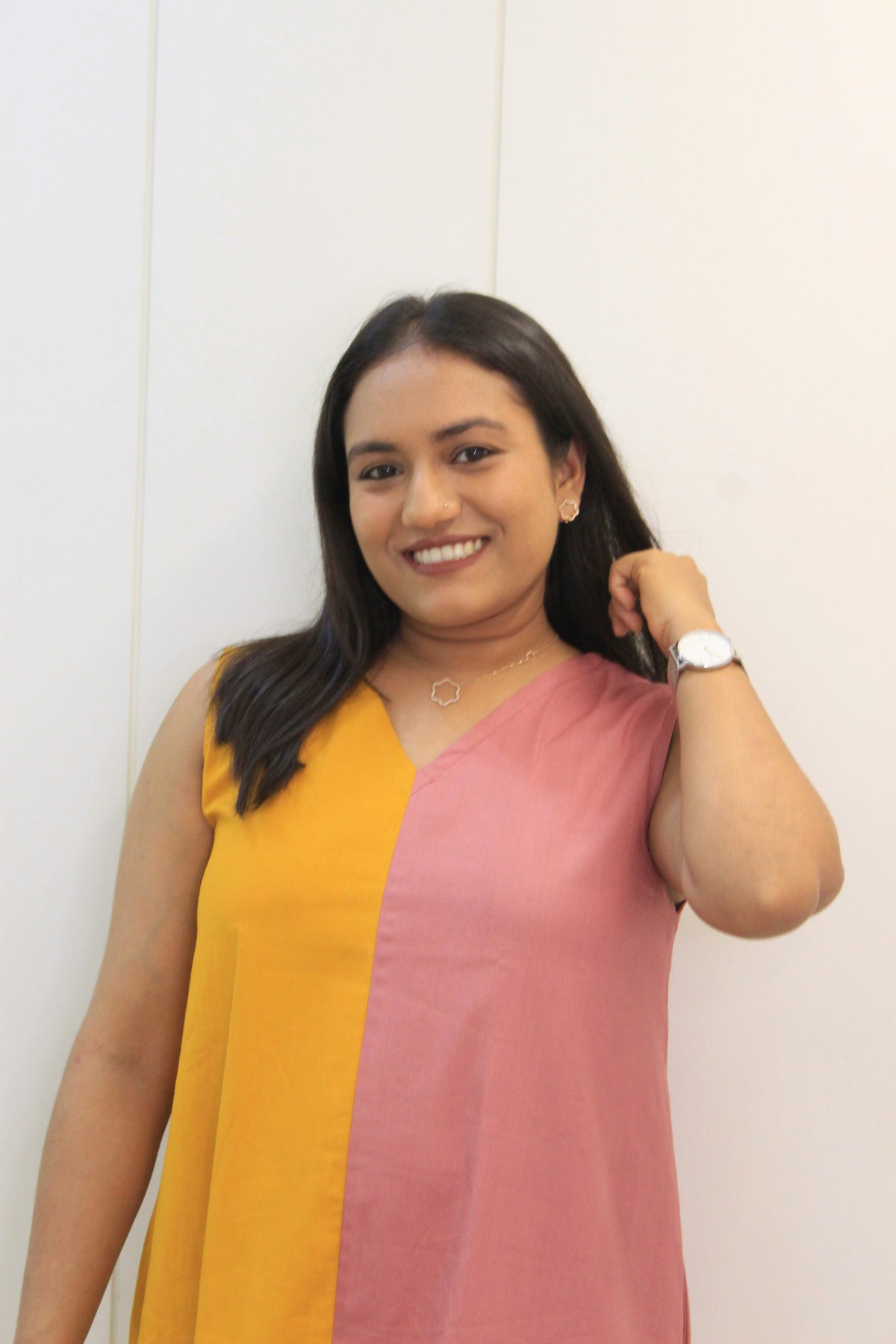 • Color: Mustard yellow & rose pink (colour block)