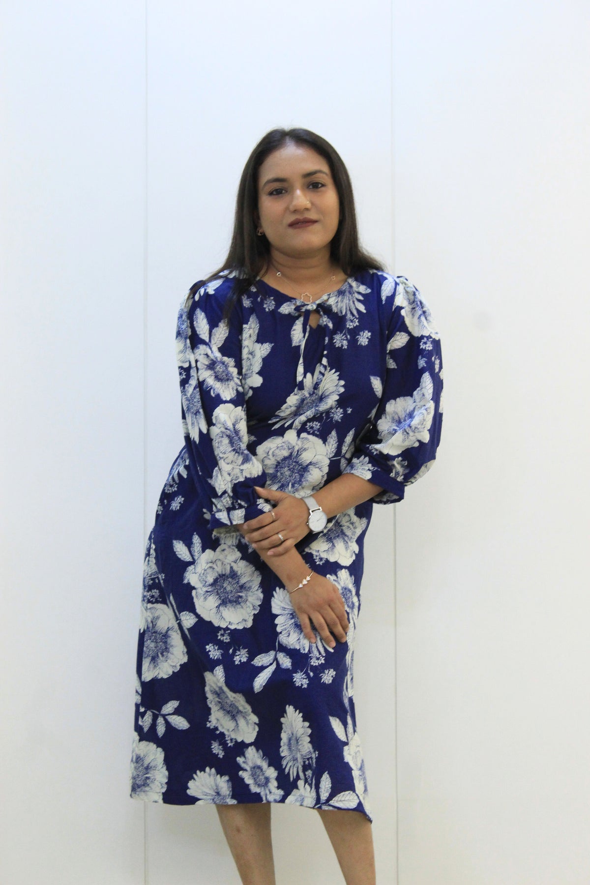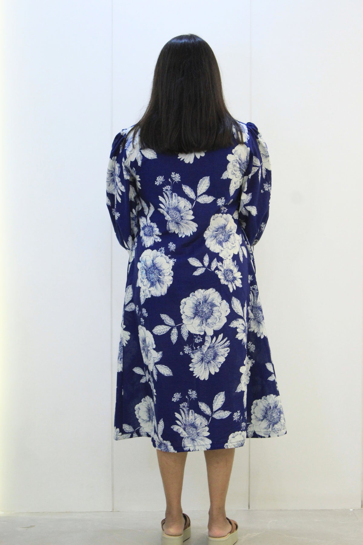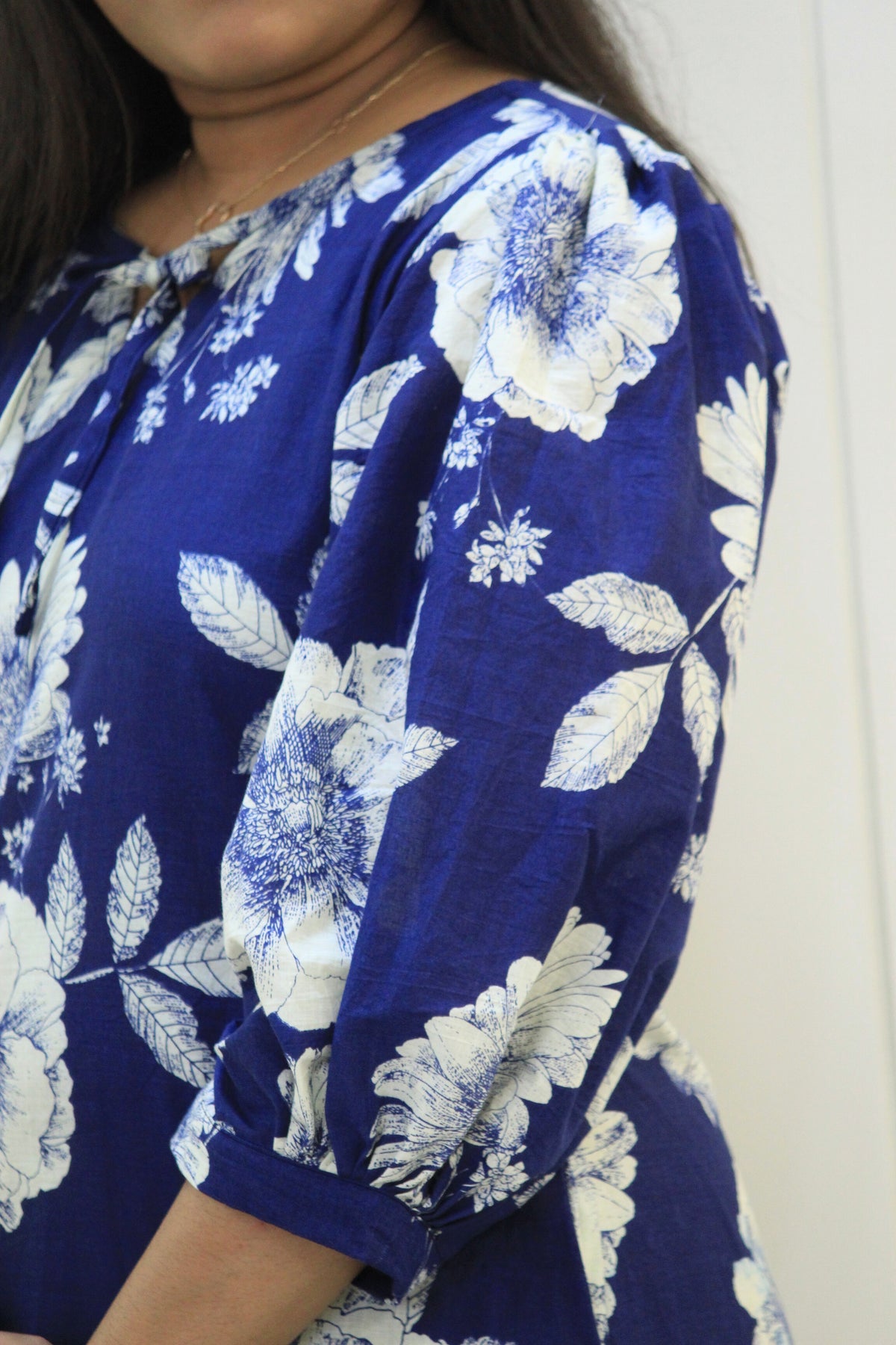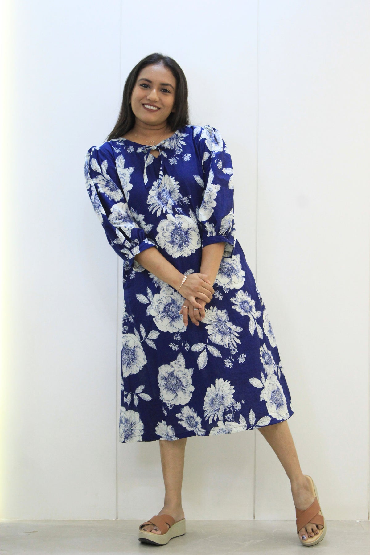 Naina – Blue Floral Cotton Dress with Balloon Sleeves