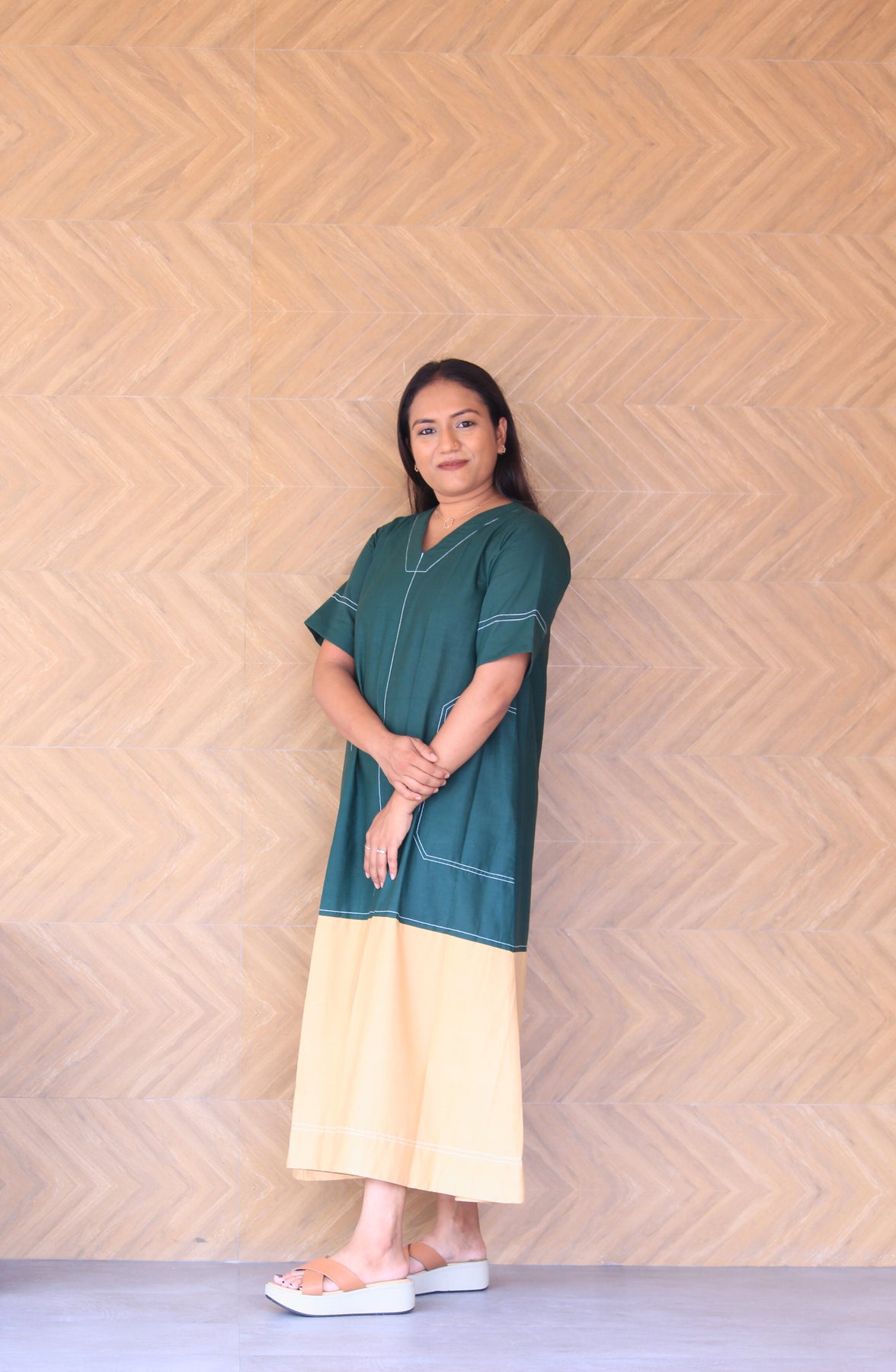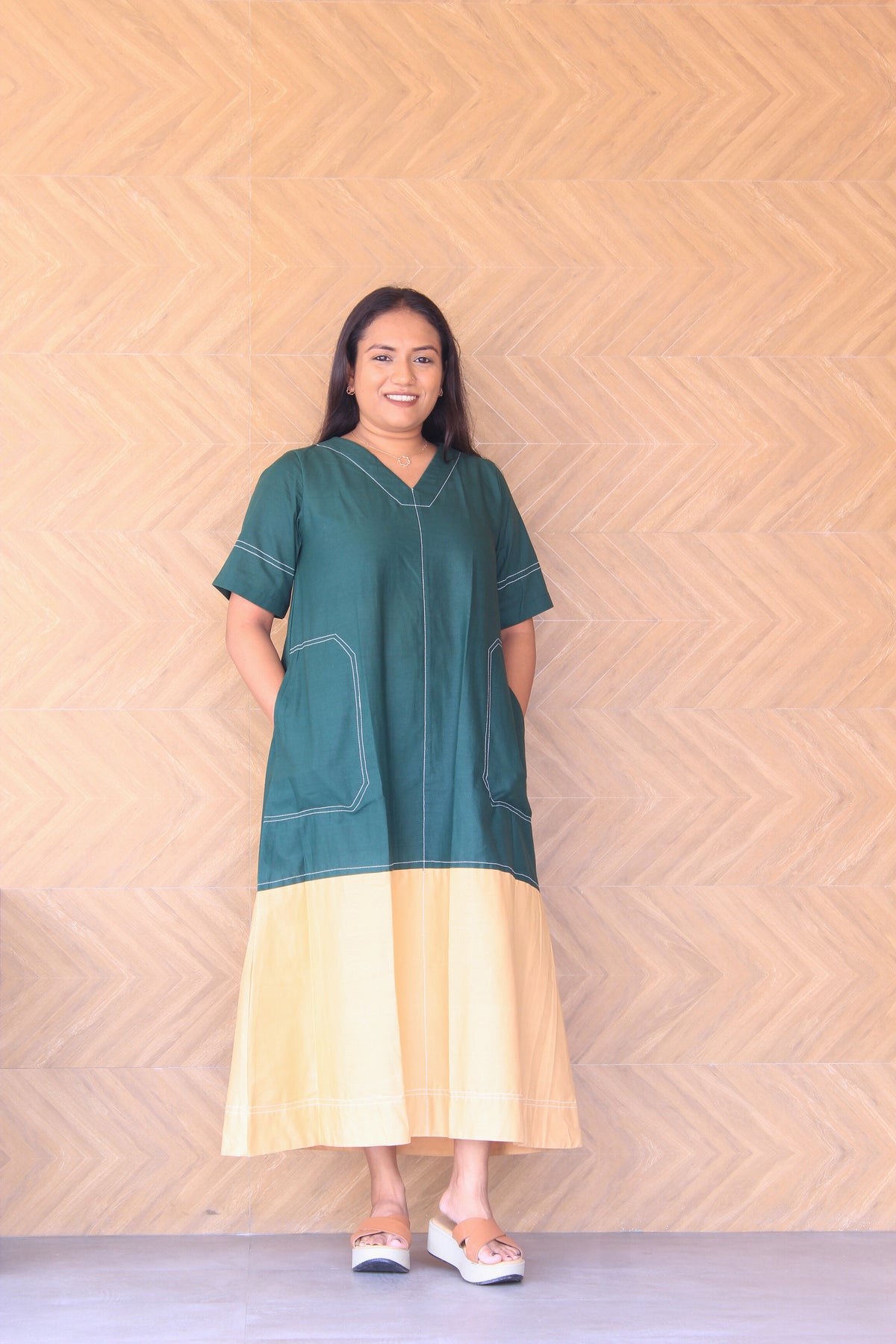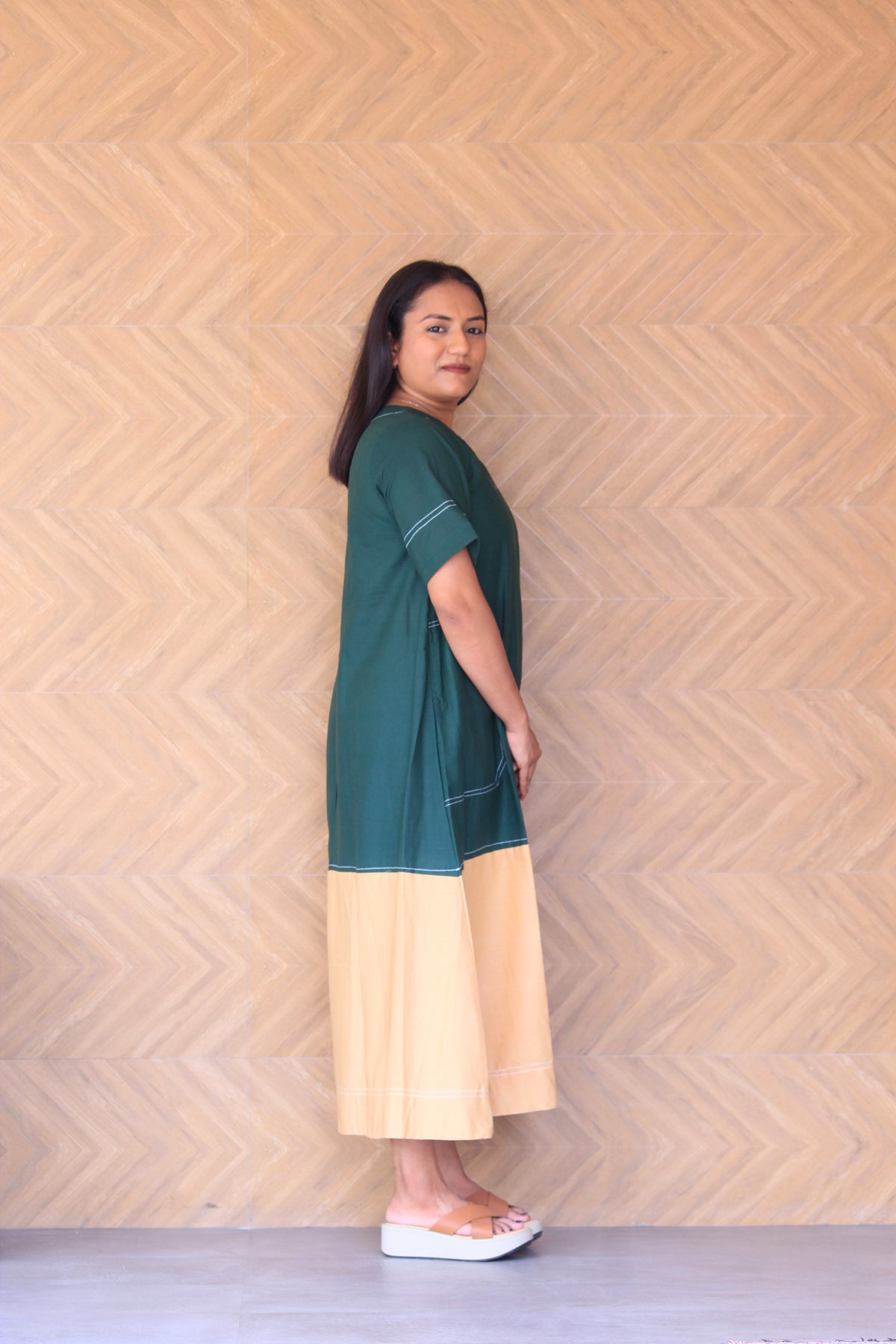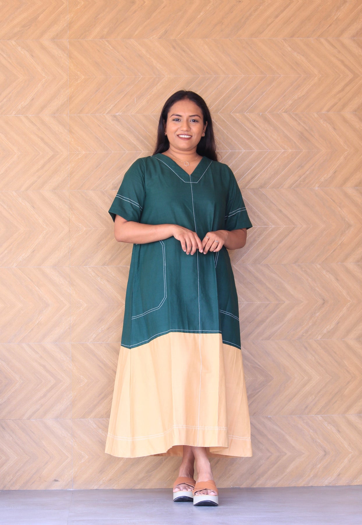 Prakruti – Green & Beige Colour Block Cotton Dress