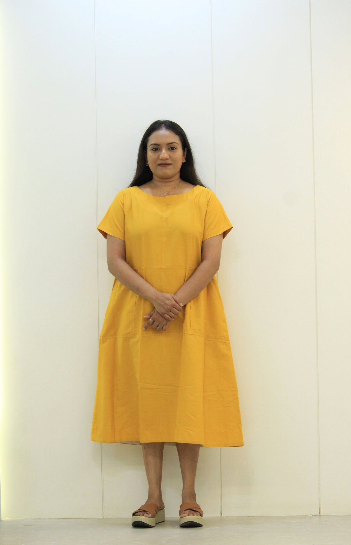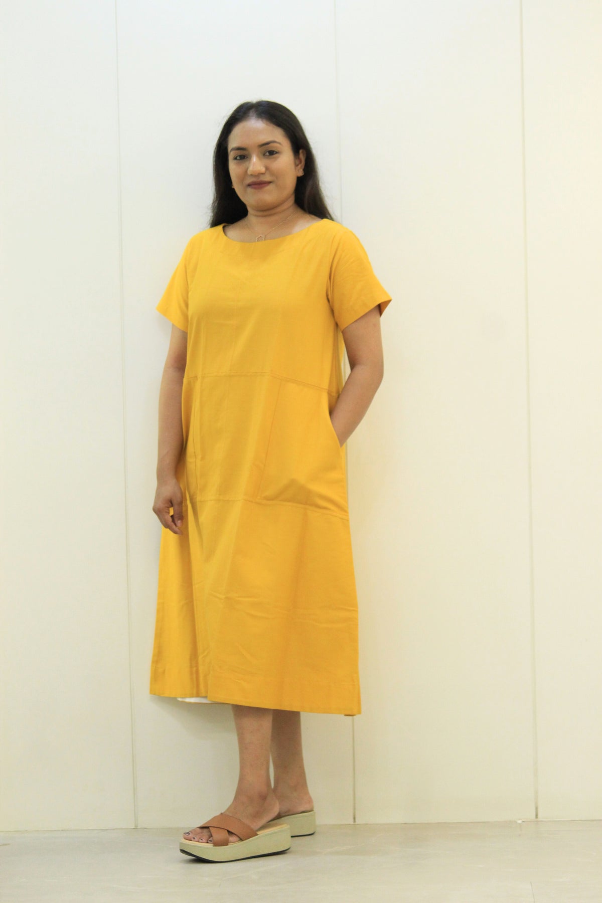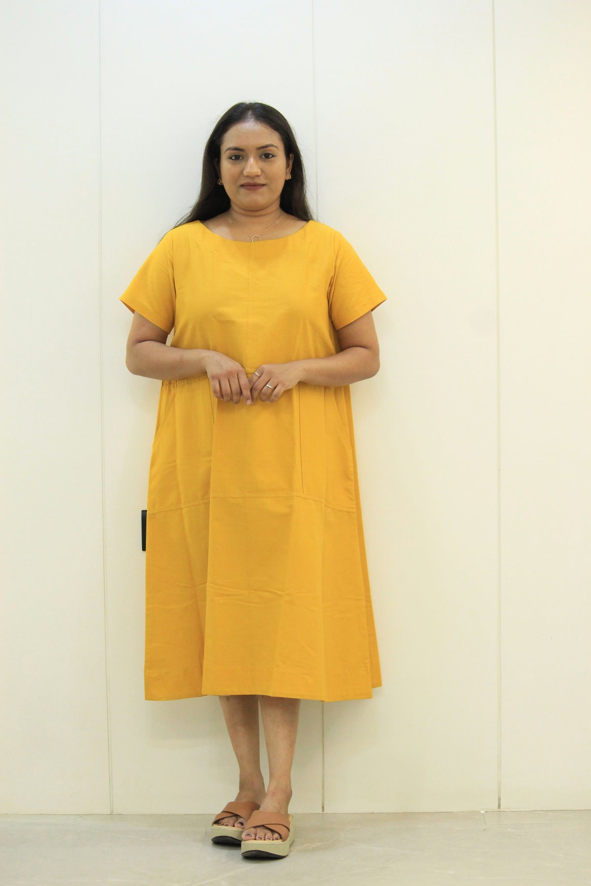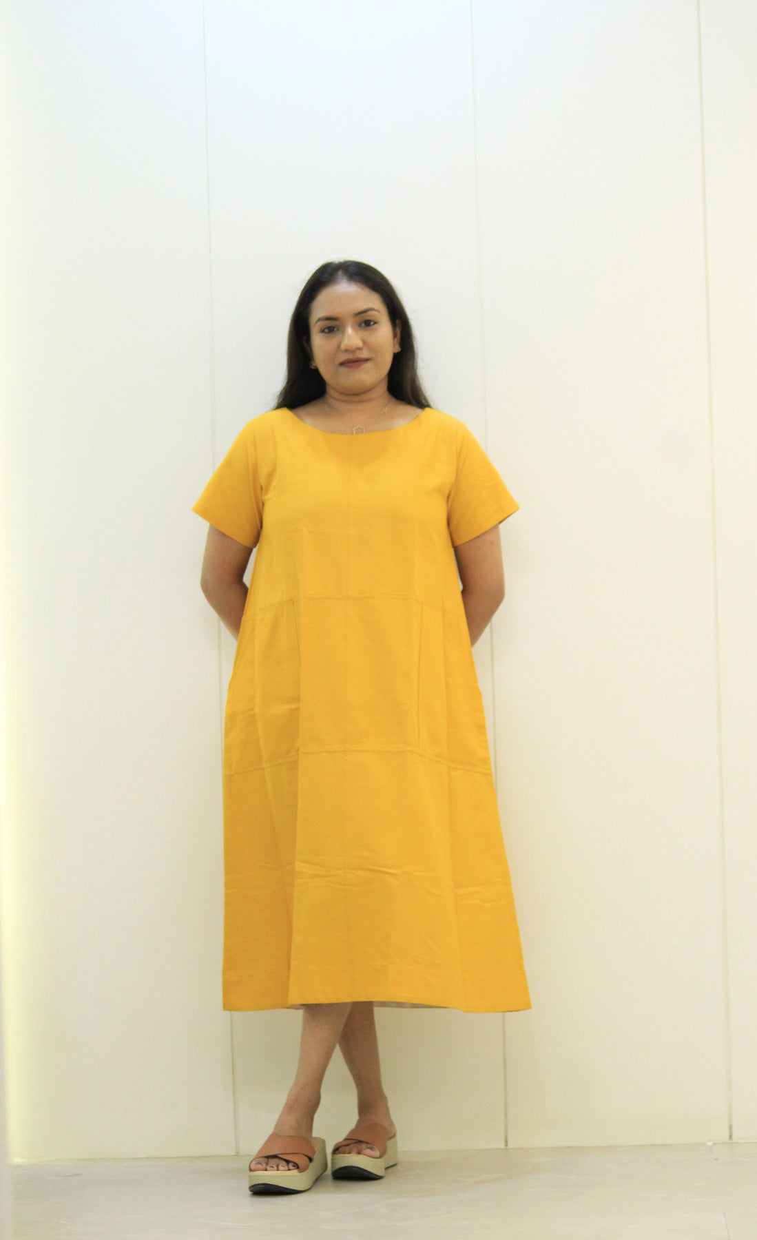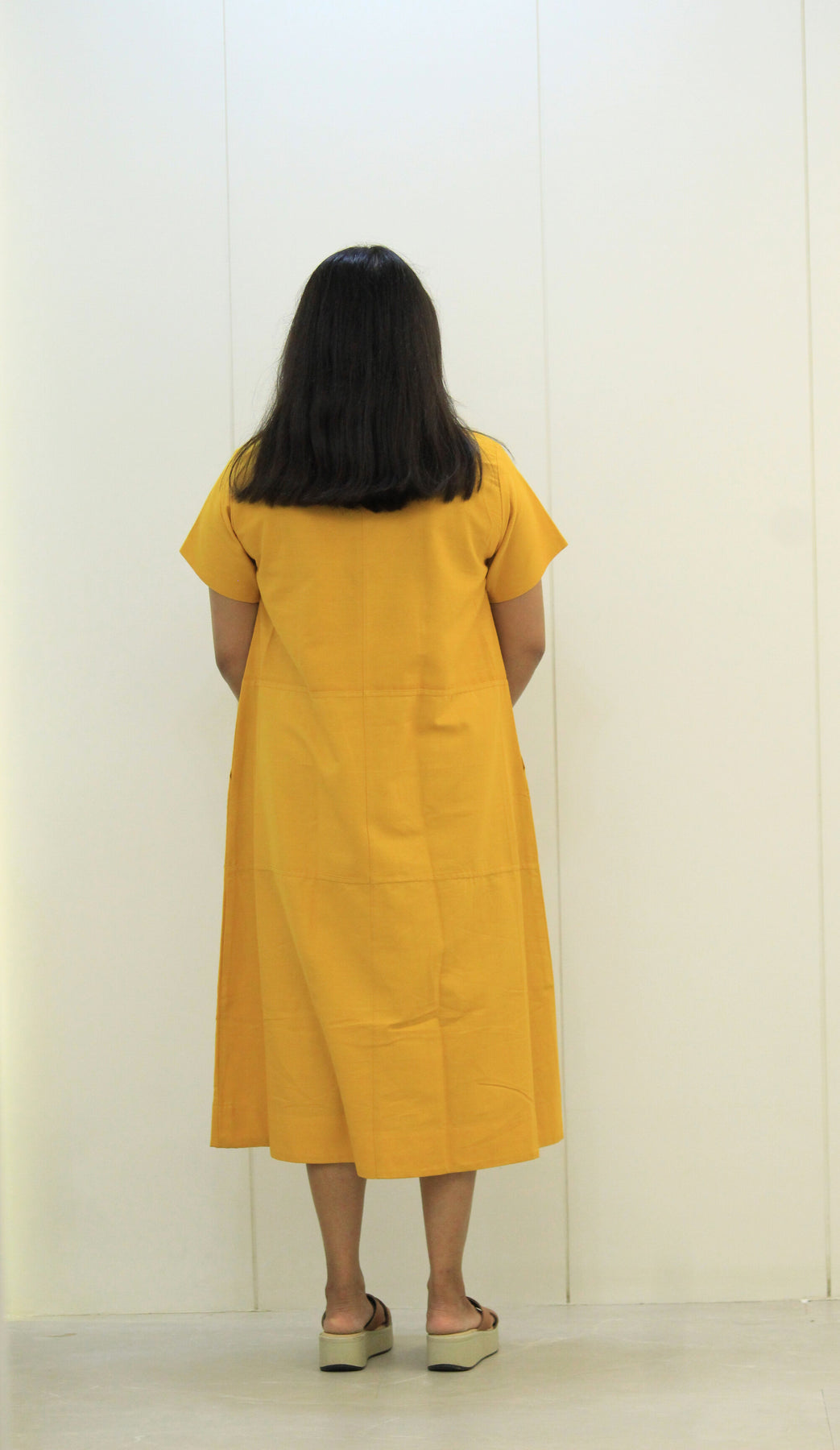 The Suryamukhi dress is all about easy charm. With its cheerful mustard yellow color, soft cotton fabric, and relaxed fit, this dress is perfect for sunny days, casual outings, or just feeling good.
