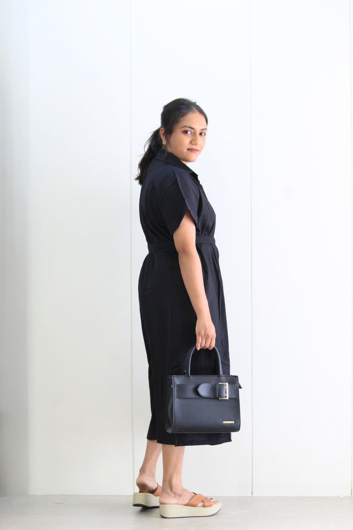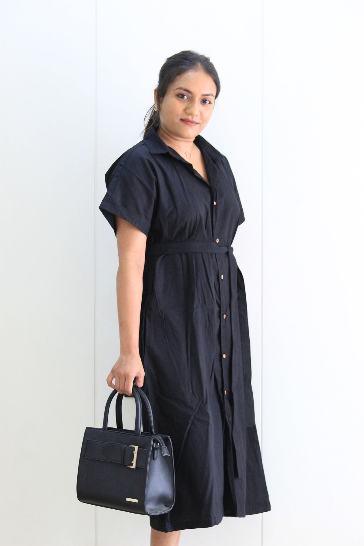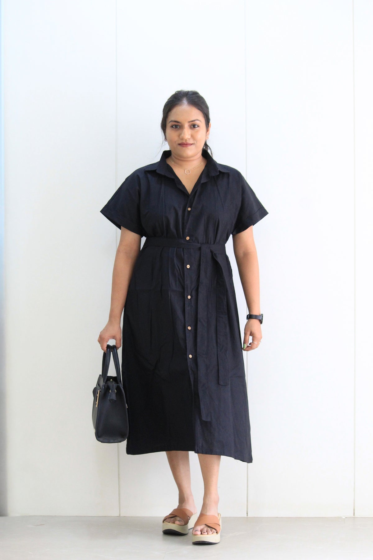 The Indu dress is your go-to everyday outfit. Made from soft pure cotton, it’s cool on the skin and easy to move in. The shirt-style collar, wooden buttons, and waist tie give it a clean and smart look perfect for work, brunch, or just stepping out in style.