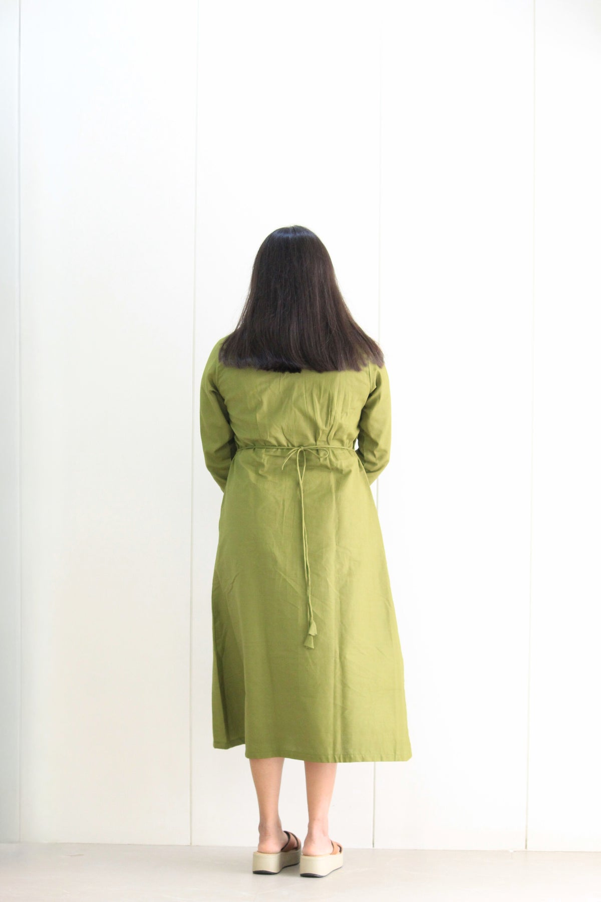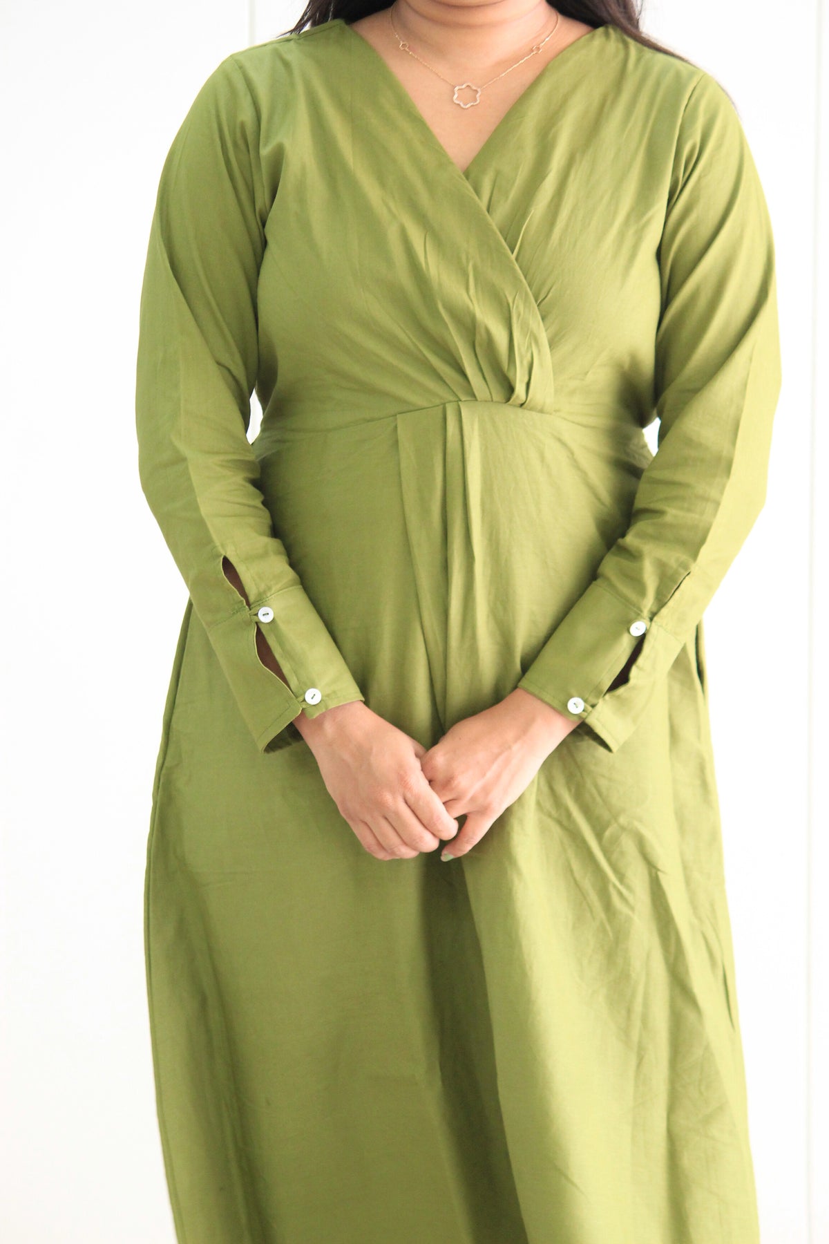 The Vedika dress is perfect when you want something simple yet stylish. Made from soft pure cotton in a pretty mehndi green, it wraps neatly at the bust and ties at the back for a flattering fit. The gentle pleats and long cuffed sleeves make it look polished while still feeling super relaxed.