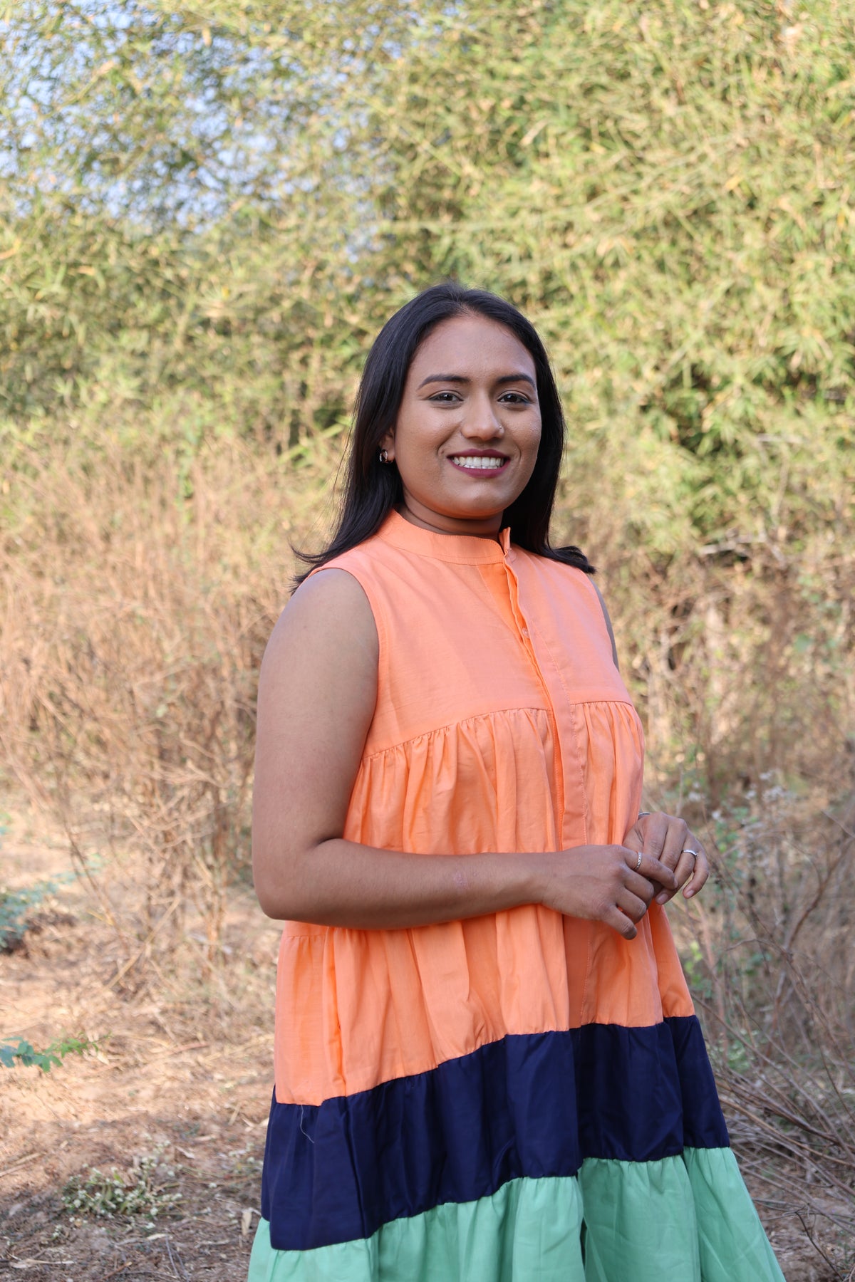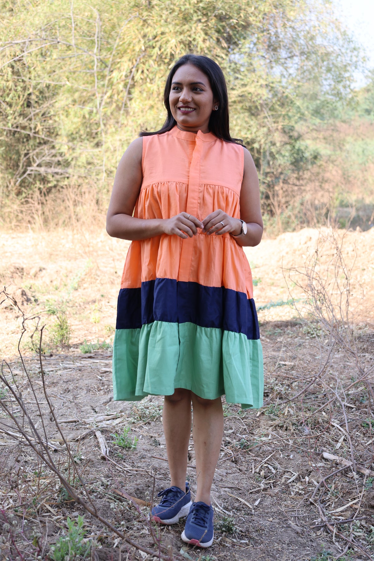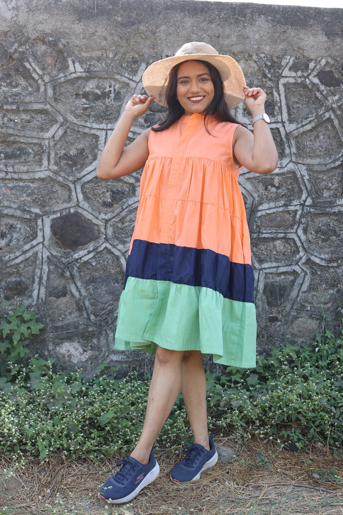 Add a splash of vibrancy to your wardrobe with the Chhuimui Short Dress—a stunning fusion of playful colors and effortless comfort. Crafted from 100% pure cotton, this color-block tiered dress features a flattering A-line silhouette with a mandarin collar, making it the perfect casual summer dress. Whether you're out for brunch, a day trip, or just enjoying a relaxed day, this breathable cotton dress for women keeps you cool and stylish.