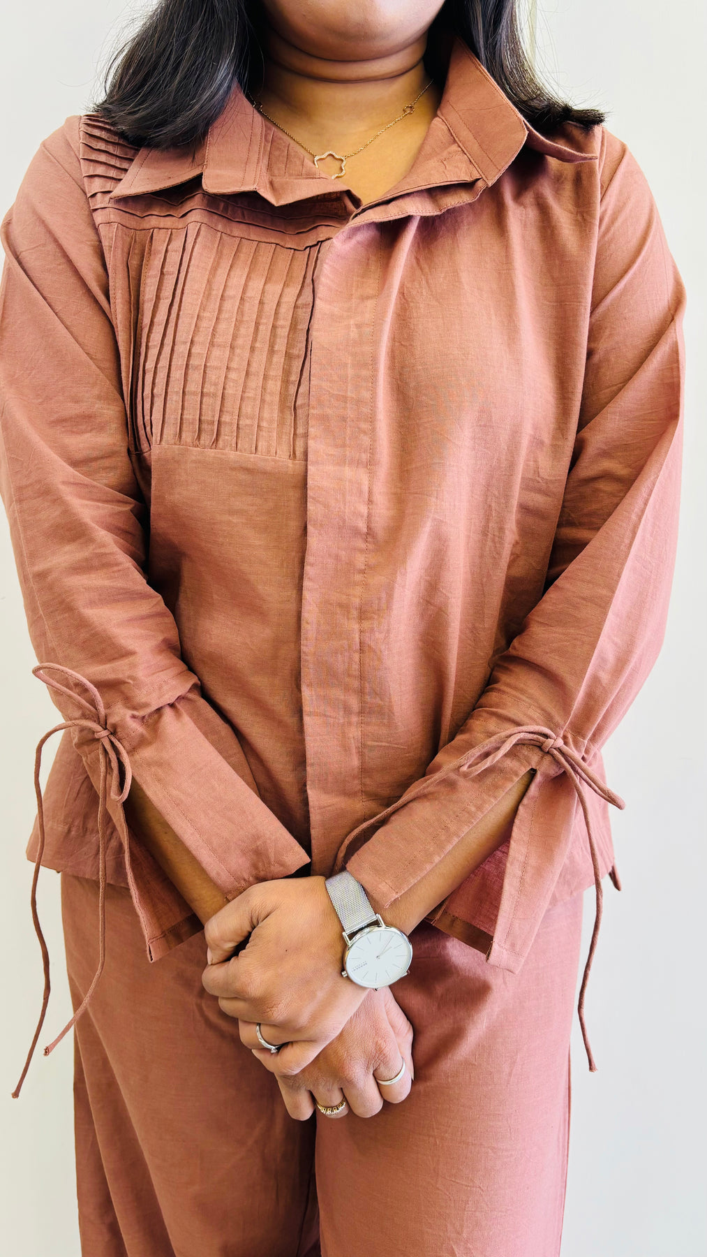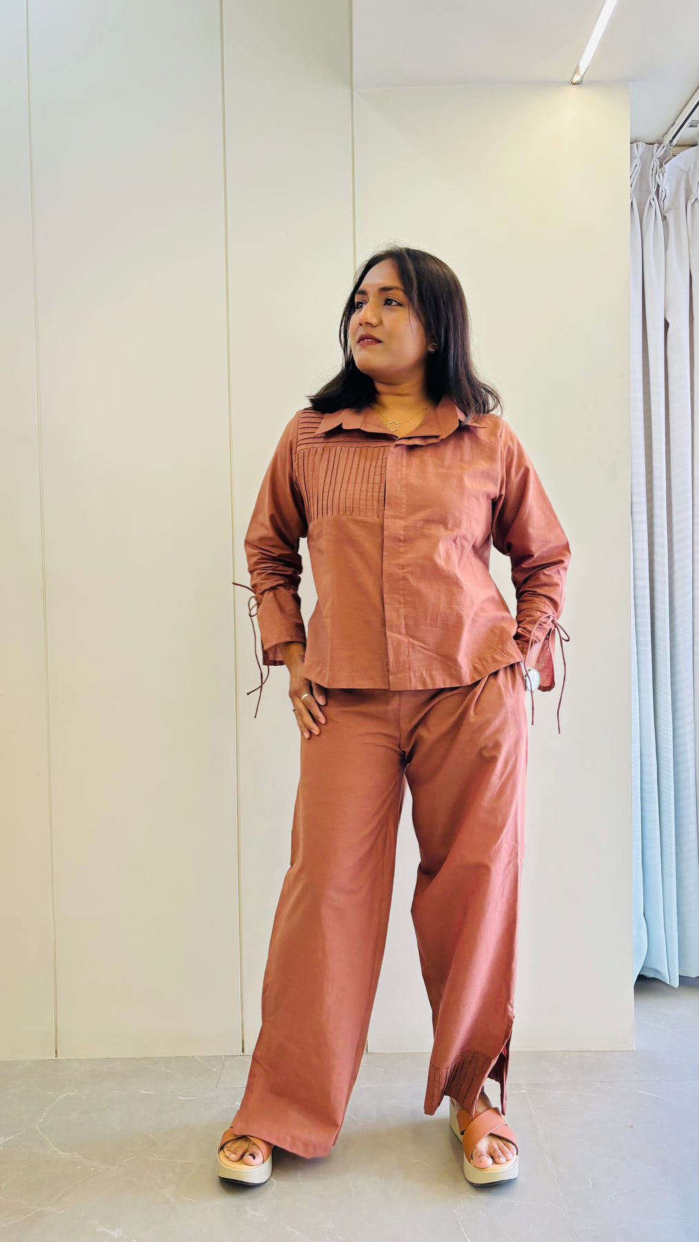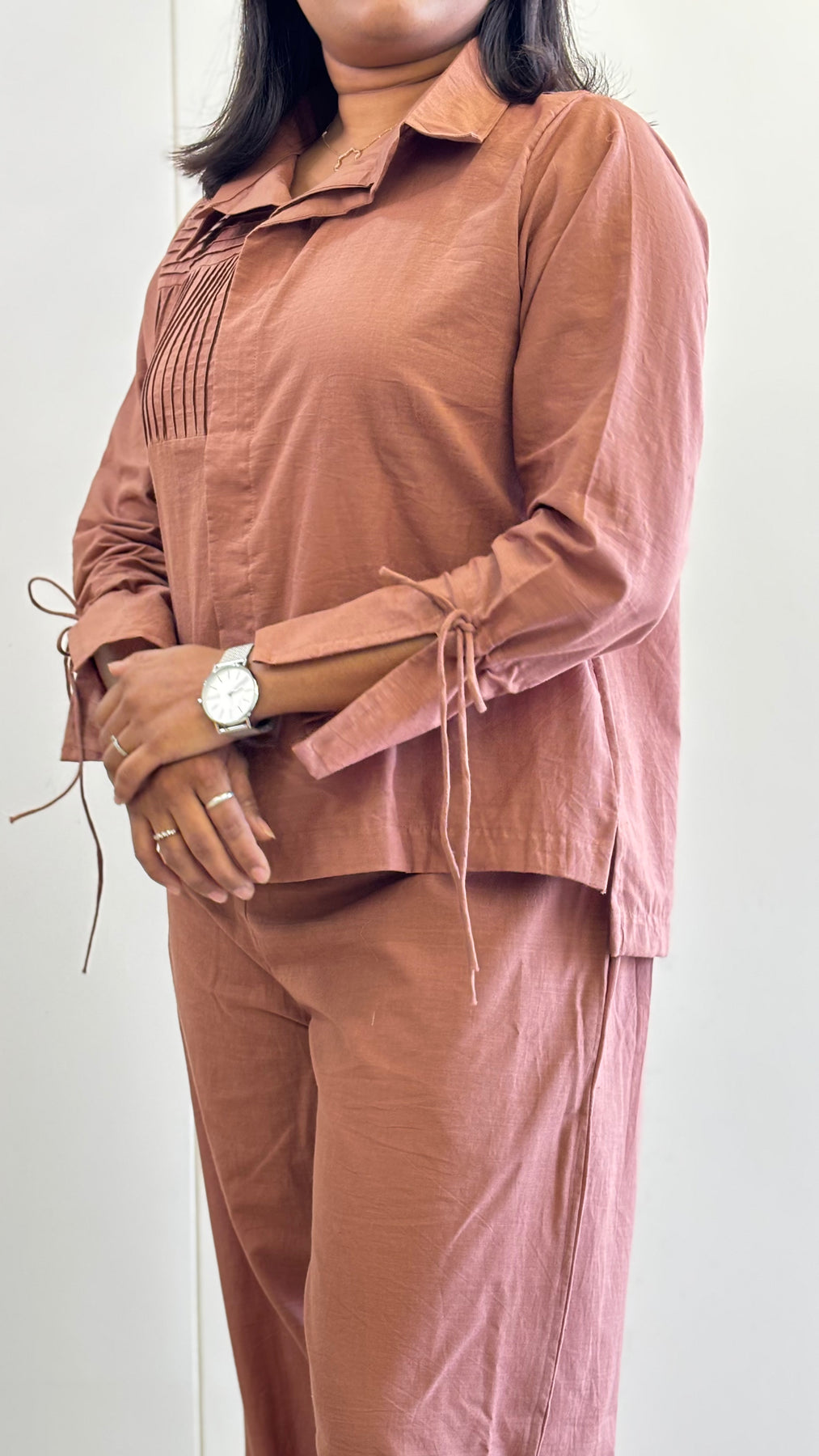 Pure cotton brown shirt with a chic pleated design and adjustable string detailing, paired with matching pants. A stylish co-ord set for effortless elegance.