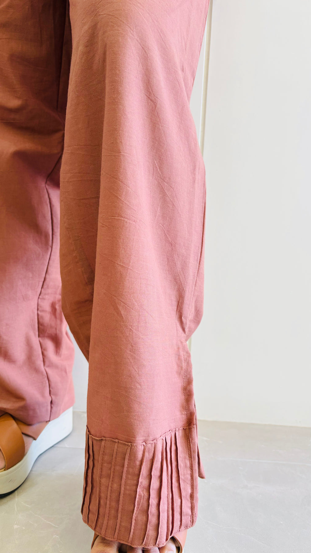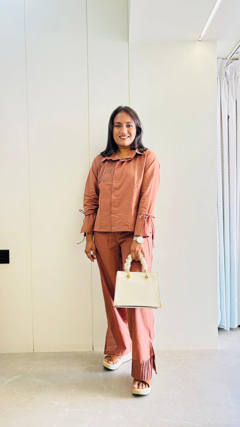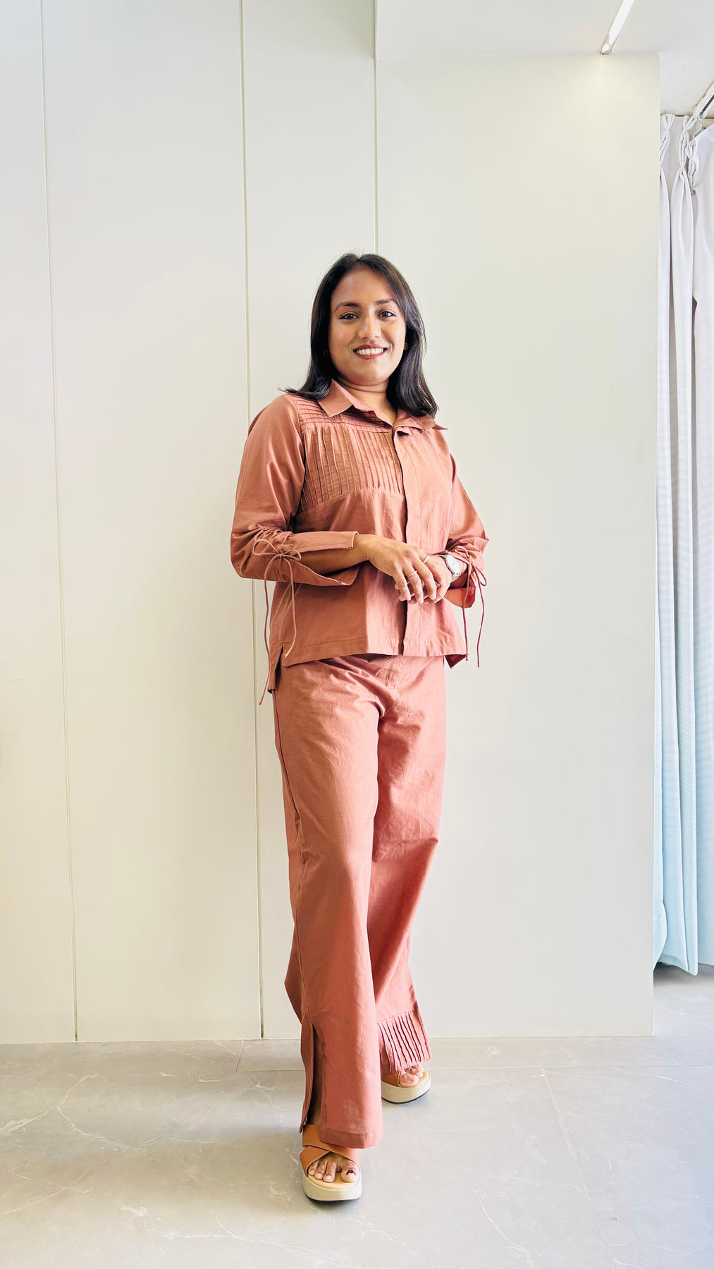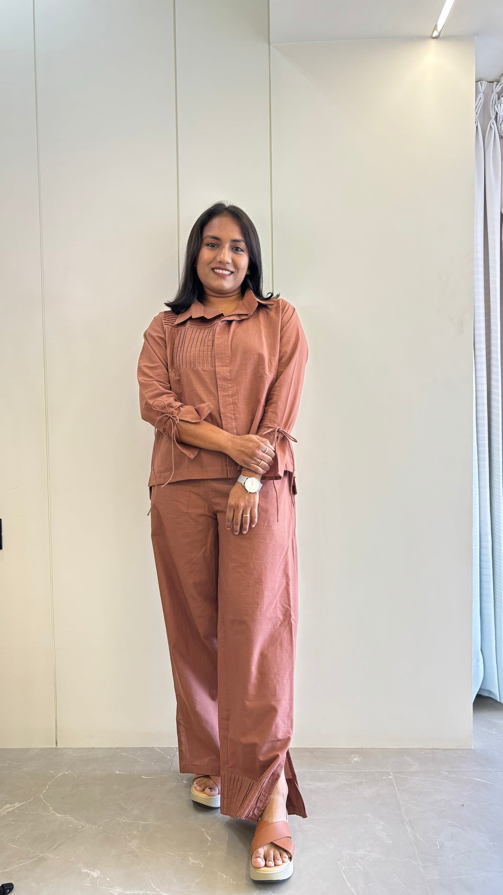Pure cotton brown shirt with a chic pleated design and adjustable string detailing, paired with matching pants. A stylish co-ord set for effortless elegance.