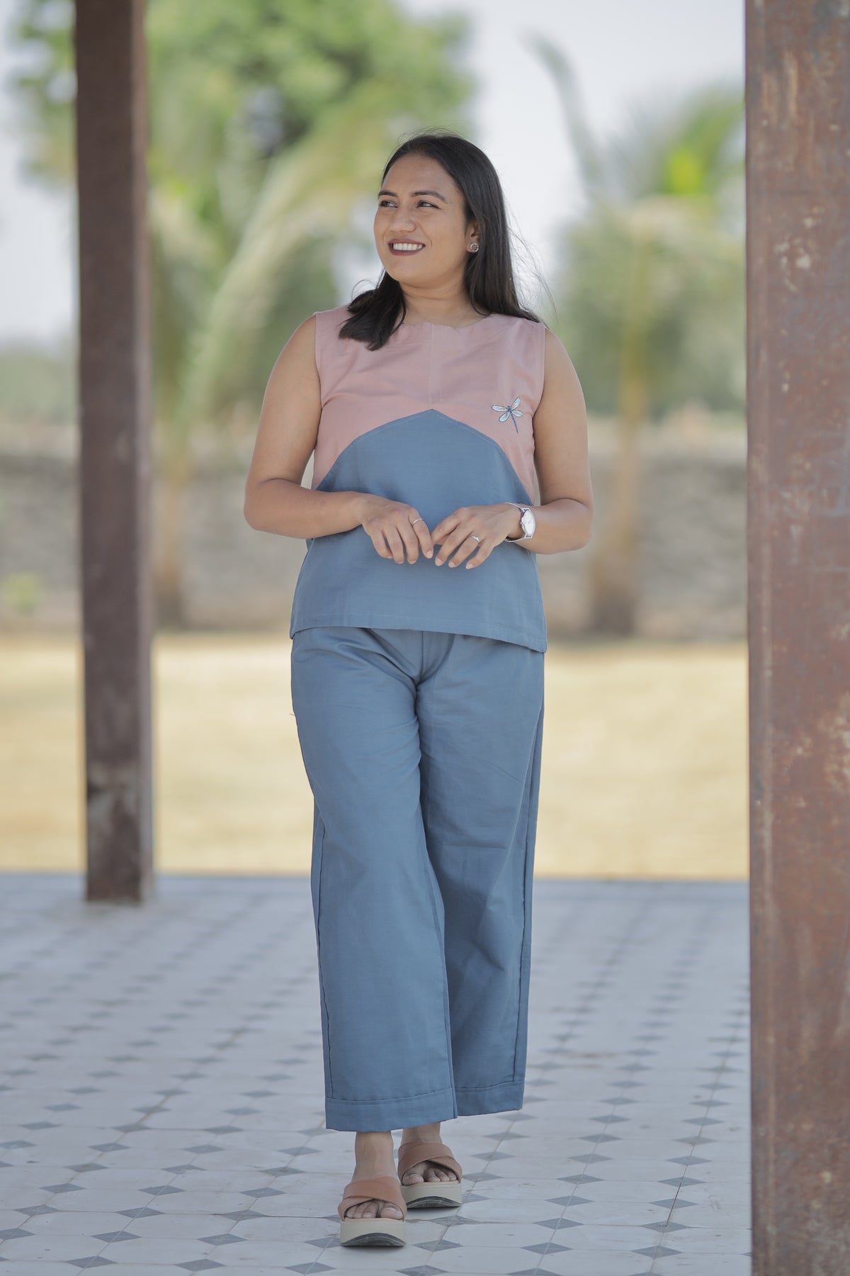 Add a breath of fresh air to your wardrobe with the Meher Co-ord Set, where playful pastels meet subtle sophistication. Crafted from 100% pure cotton, this two-piece set features a soft blush and blue colorblock palette, topped with delicate dragonfly embroidery for that sweet summer charm. It's breezy, light, and ready to go wherever your day takes you – brunch, holidays, or just lounging in style.