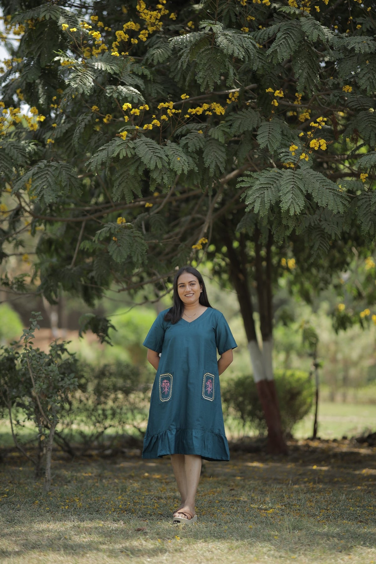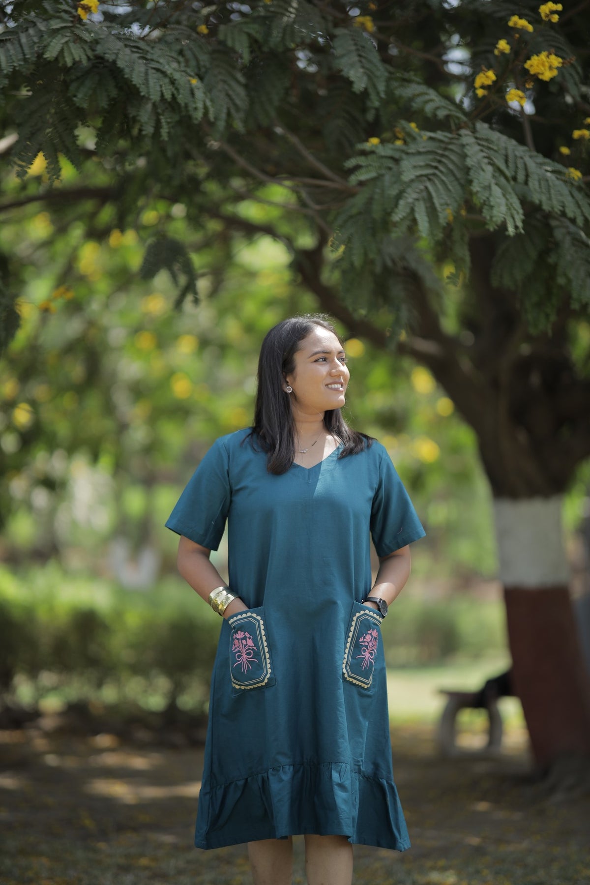 Make everyday elegance effortless with the Varnika Dress — a breathable and beautifully tailored cotton staple. Designed in a deep teal hue, this dress features charming floral embroidery on both pockets, adding a hint of handcrafted charm. The gathered ruffle hem brings a playful touch, perfect for brunch days, cozy evenings, or casual workwear.