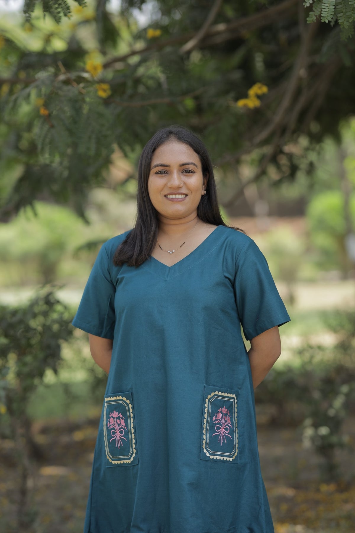 Varnika – Teal Pocket Embroidered Cotton Dress