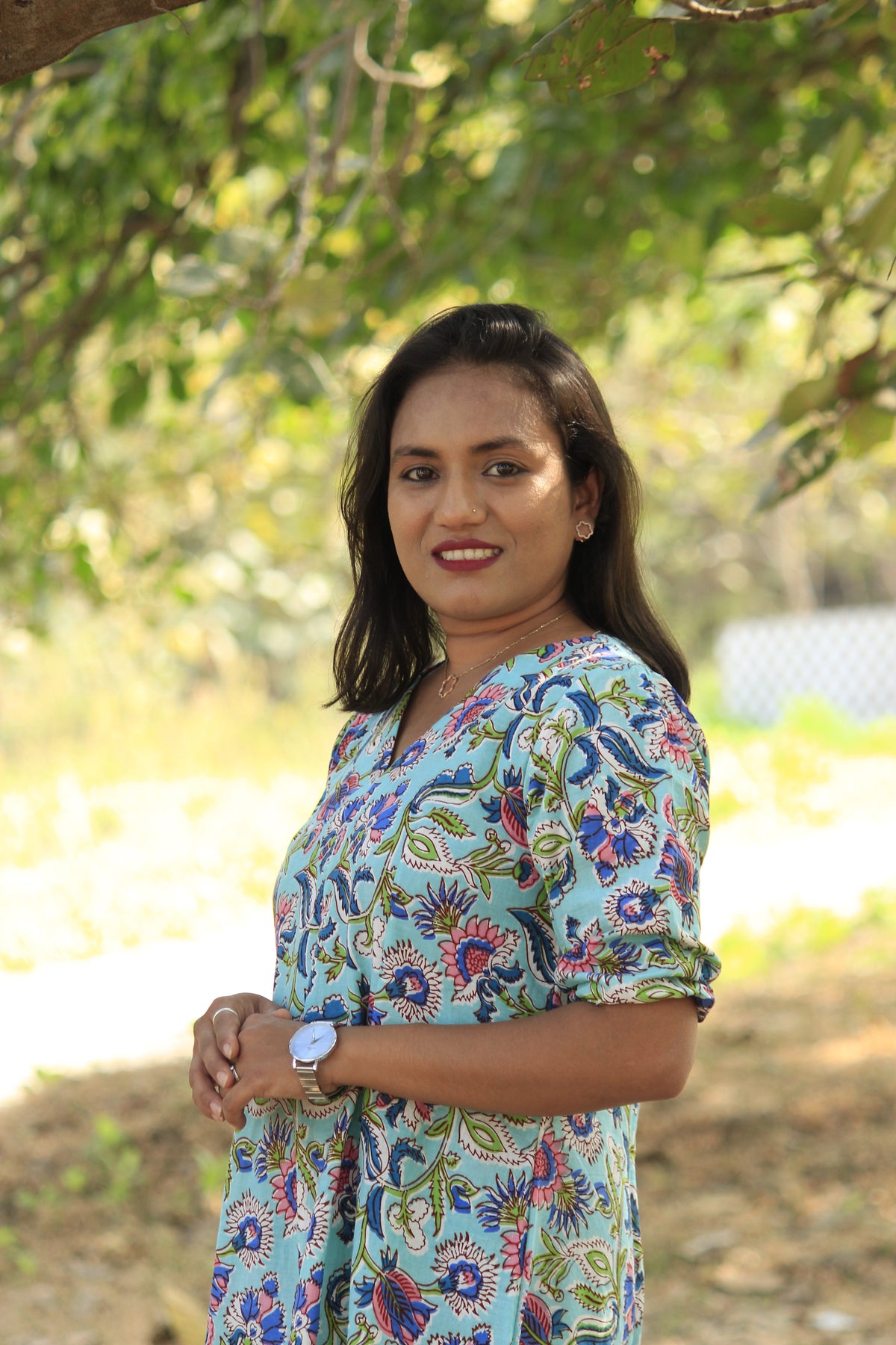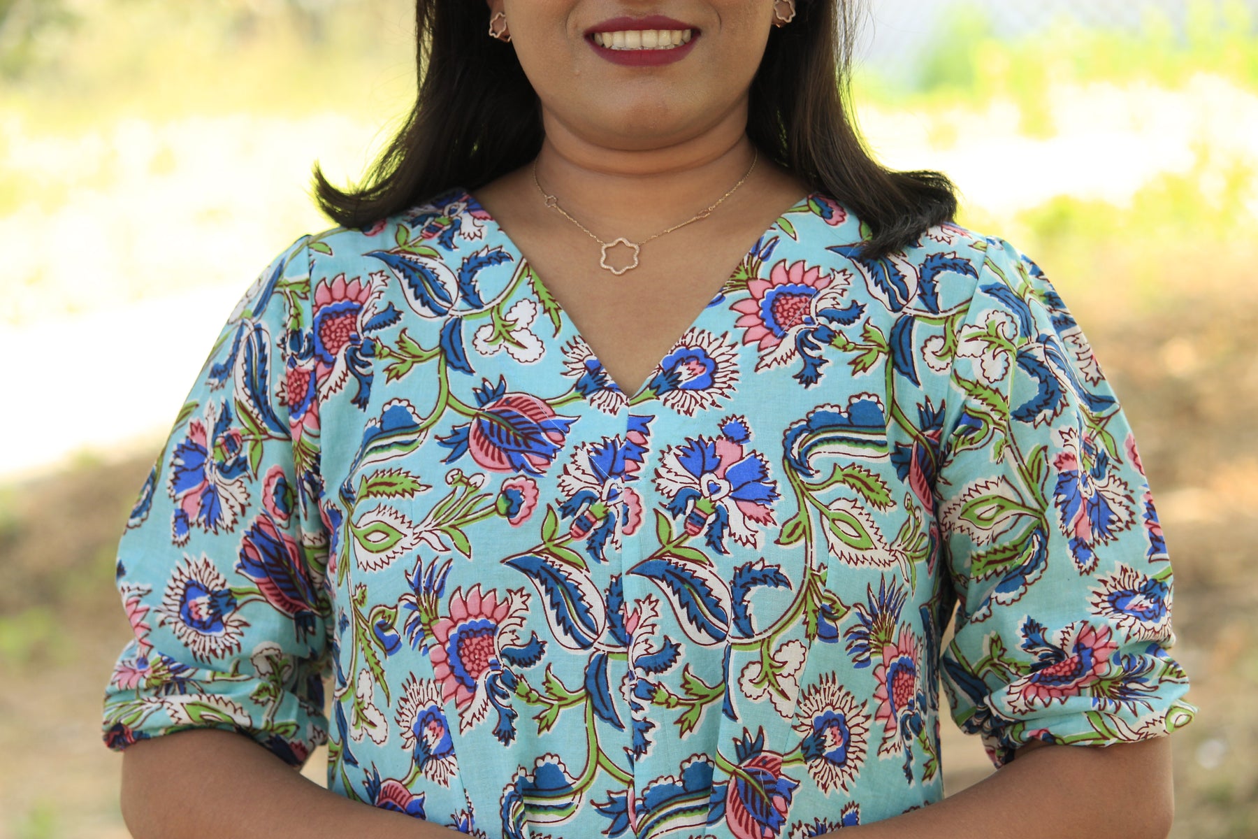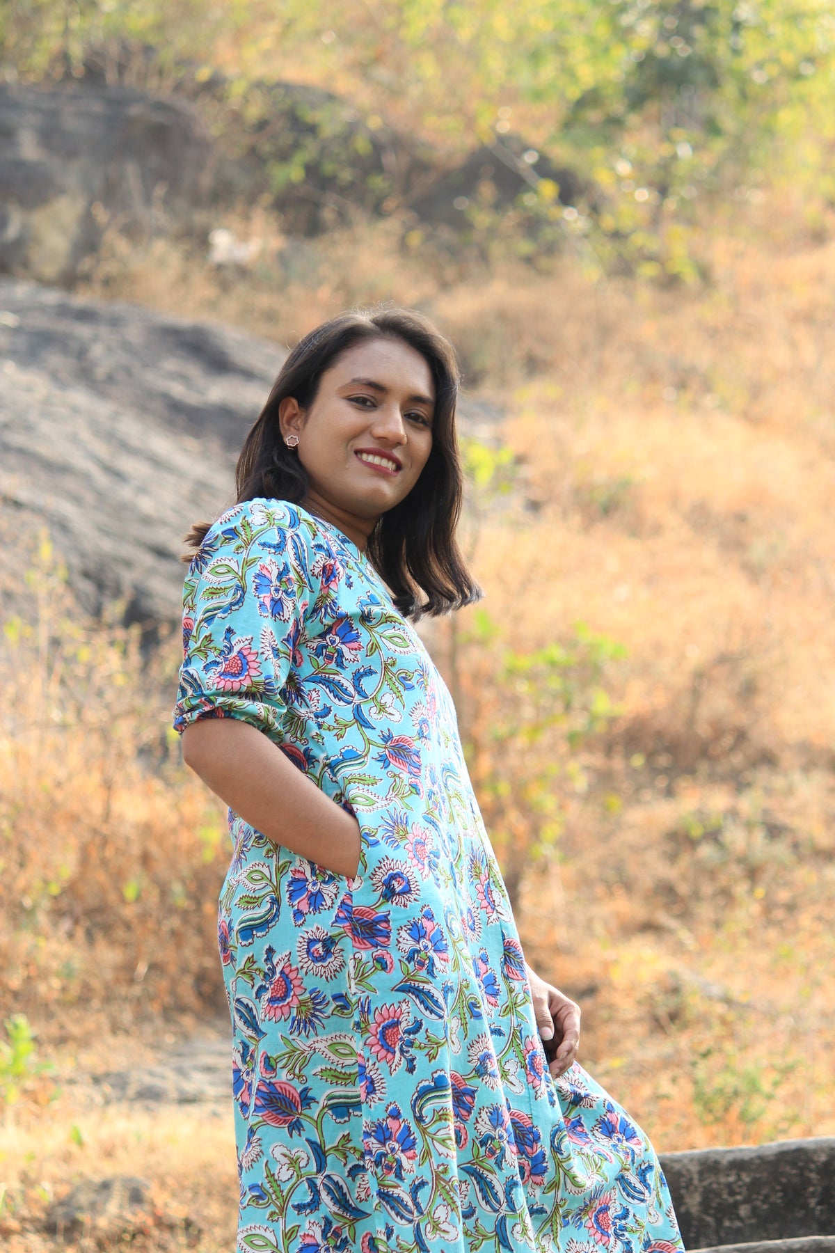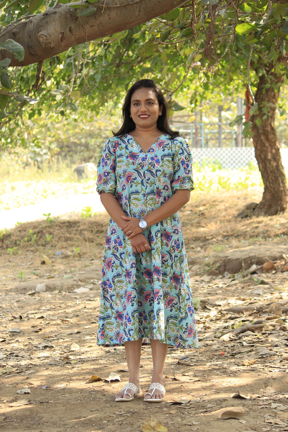Simple and comfortable midi dress in sky blue, featuring a unique block-printed floral design. Effortless elegance for everyday wear!