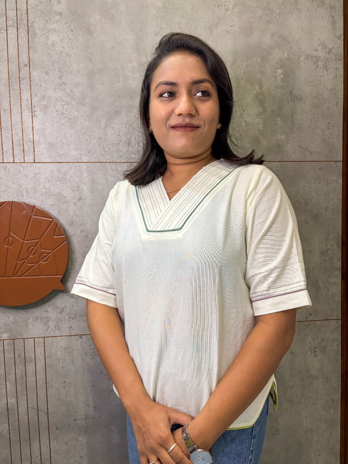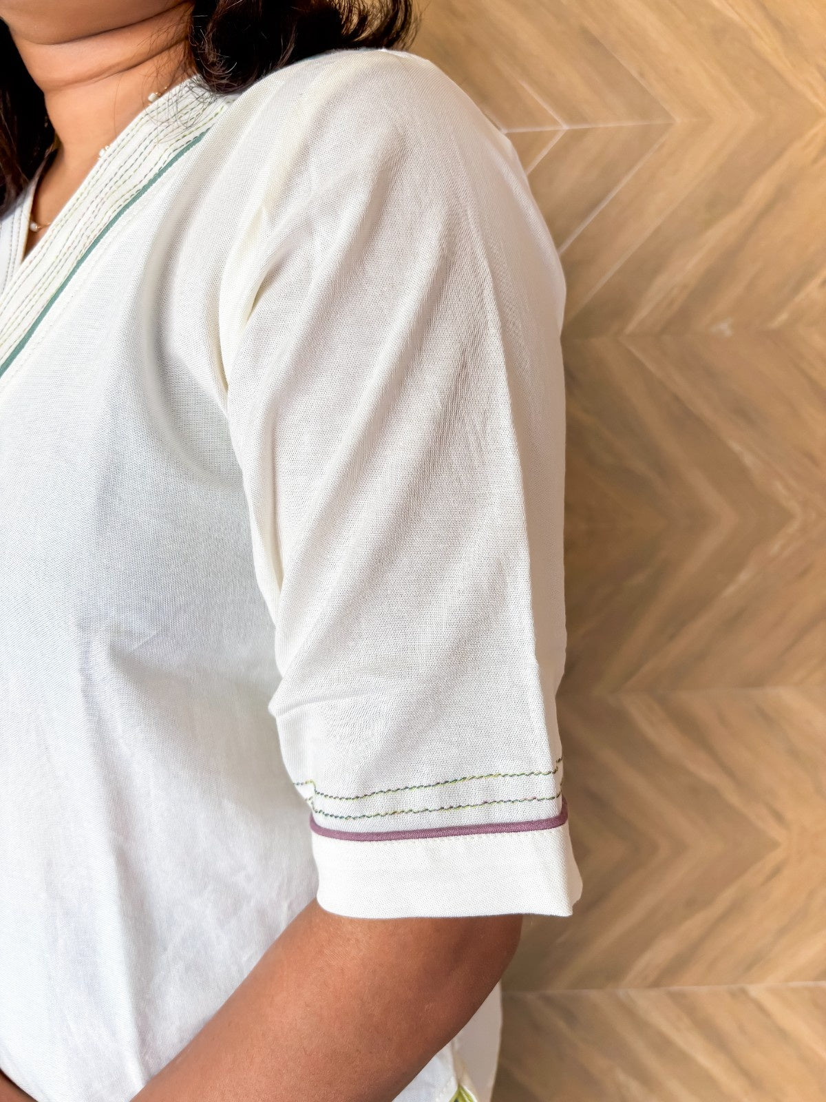 Elevate your everyday wardrobe with this Off-White Cotton-Linen Top, crafted from 100% premium cotton-linen for a soft, breathable, and comfortable fit that’s perfect for all-day wear. Featuring a chic V-neckline and elegant elbow-length sleeves, this top combines timeless style with practical comfort. Its tailored fit and airy fabric make it an ideal choice for daily wear, ensuring you stay at ease while looking effortlessly stylish.