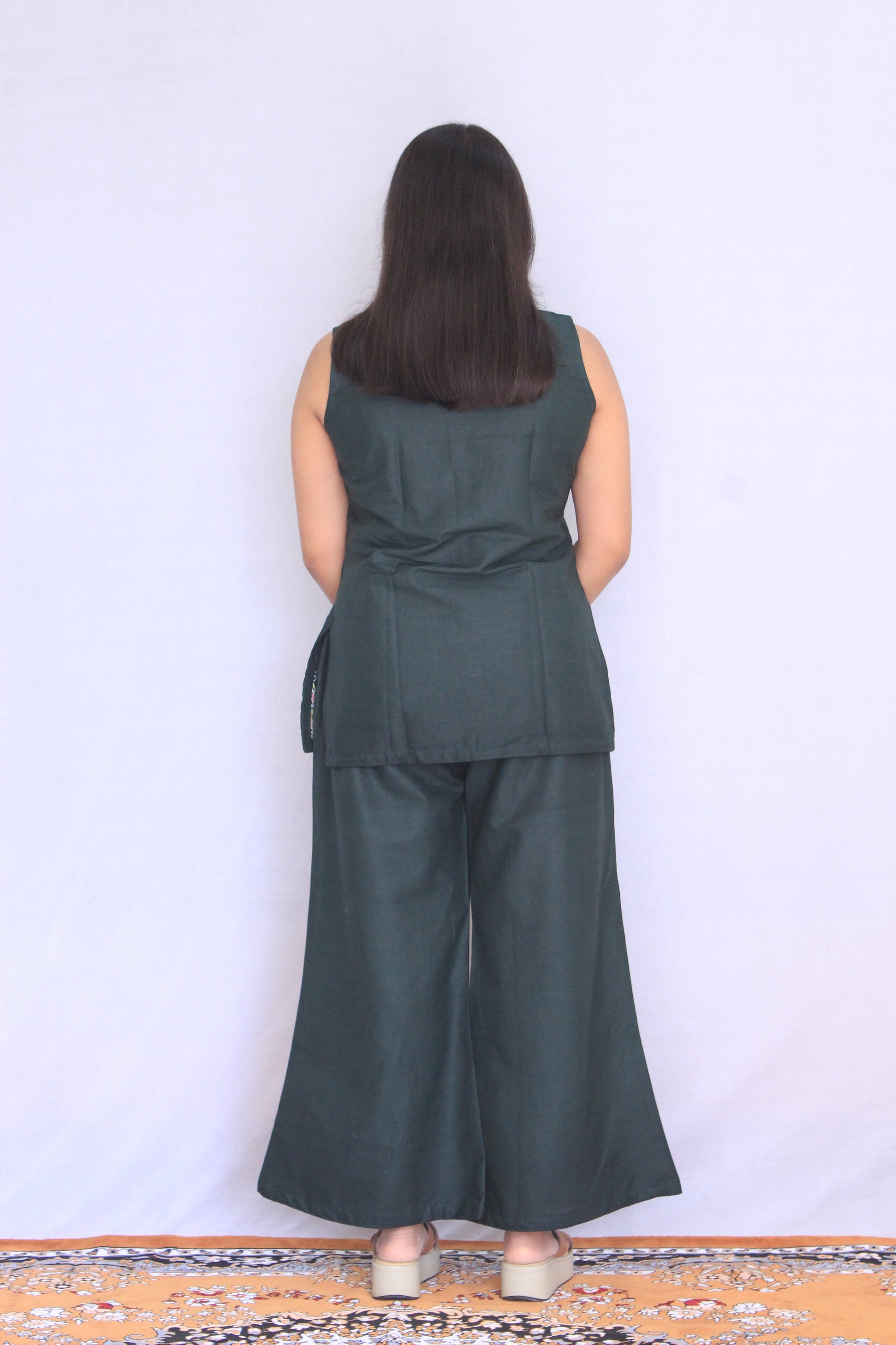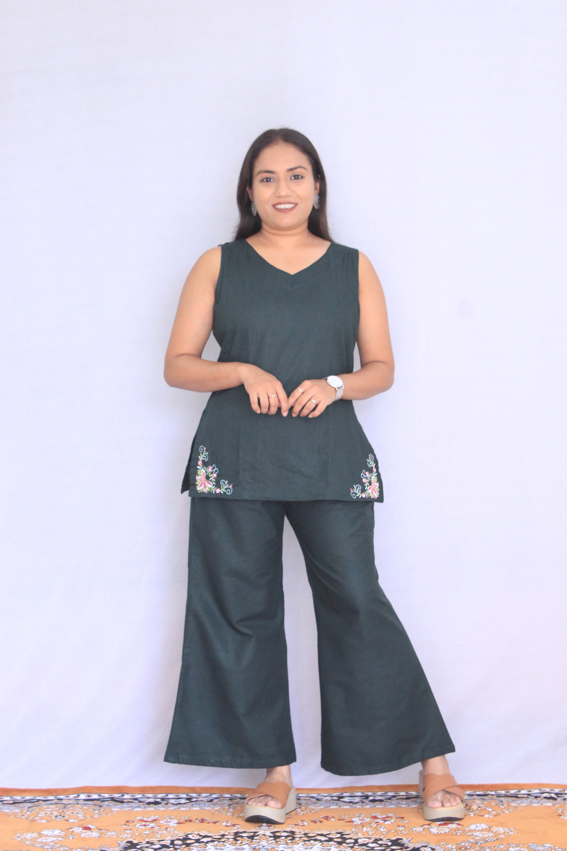 Dark Green Solid Pure Cotton Co-ord set with Embroidery on edges.