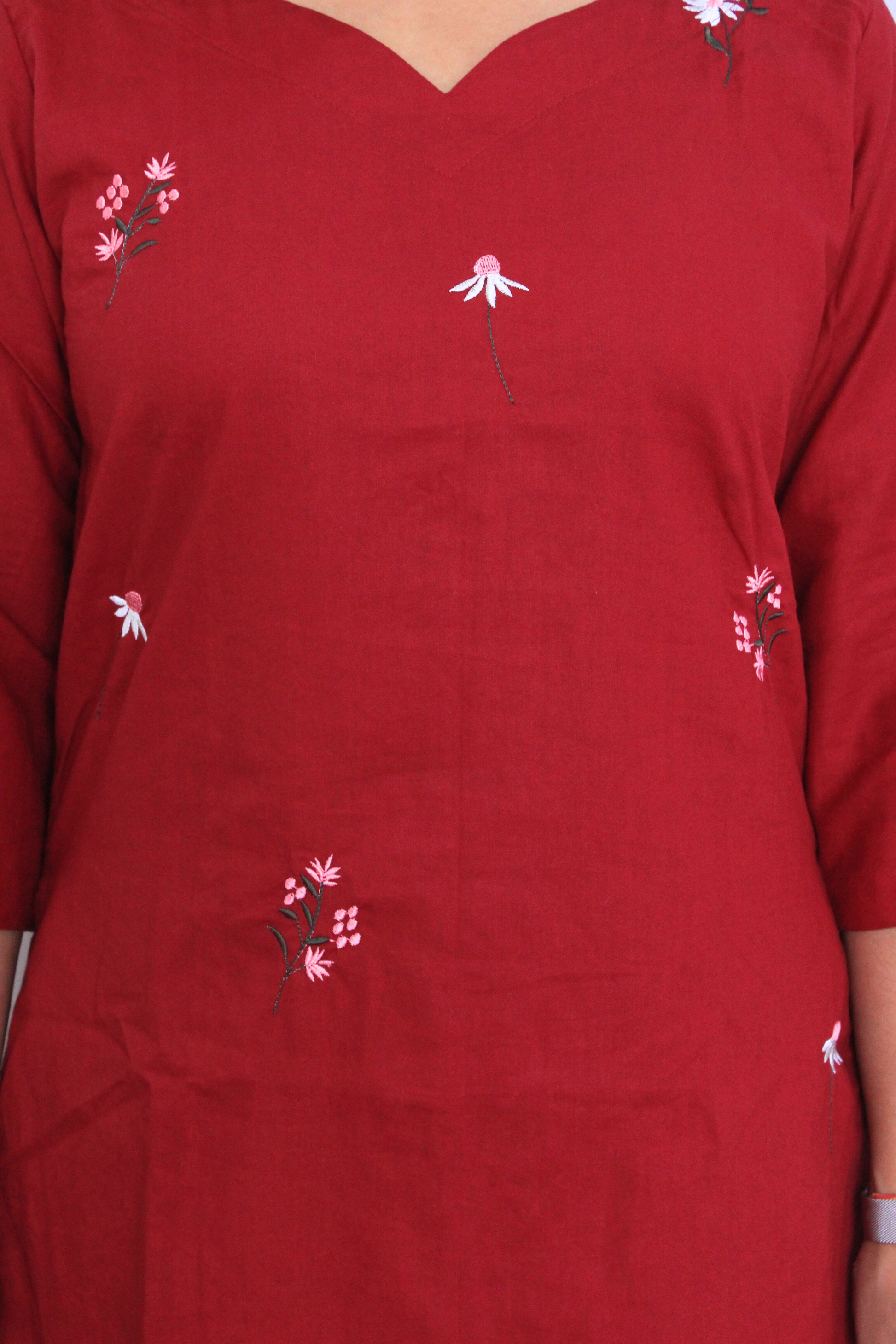 Maroon Solid Pure Cotton Co-ord set with Embroidery