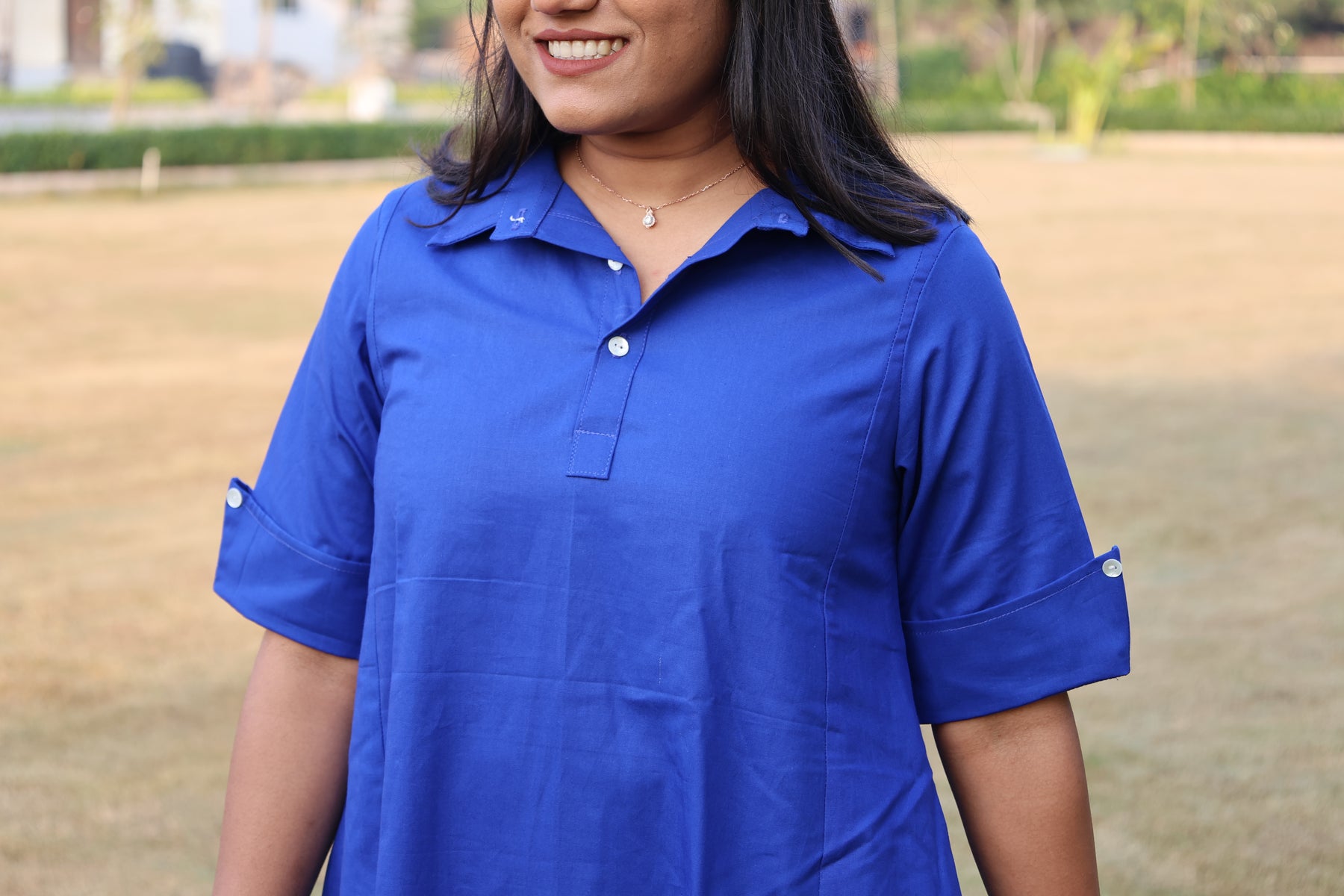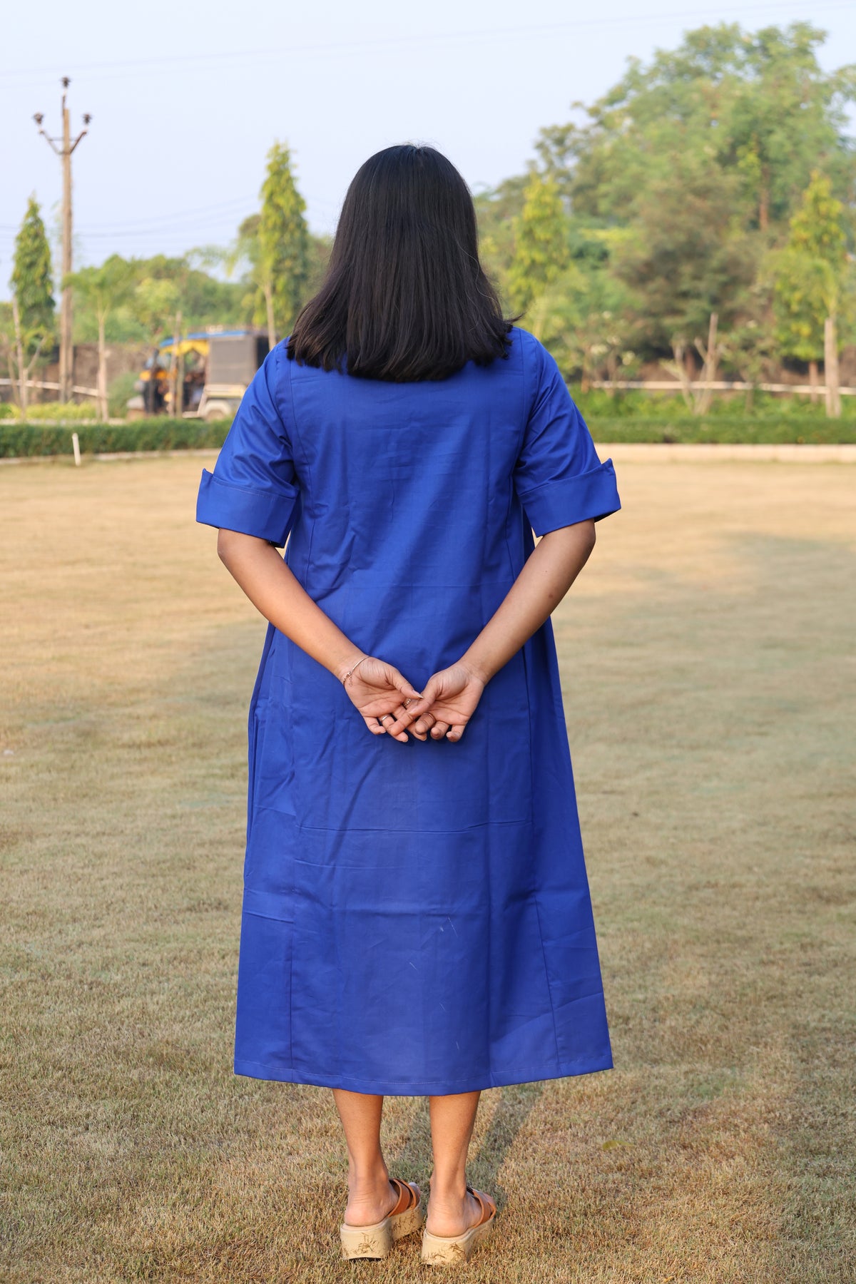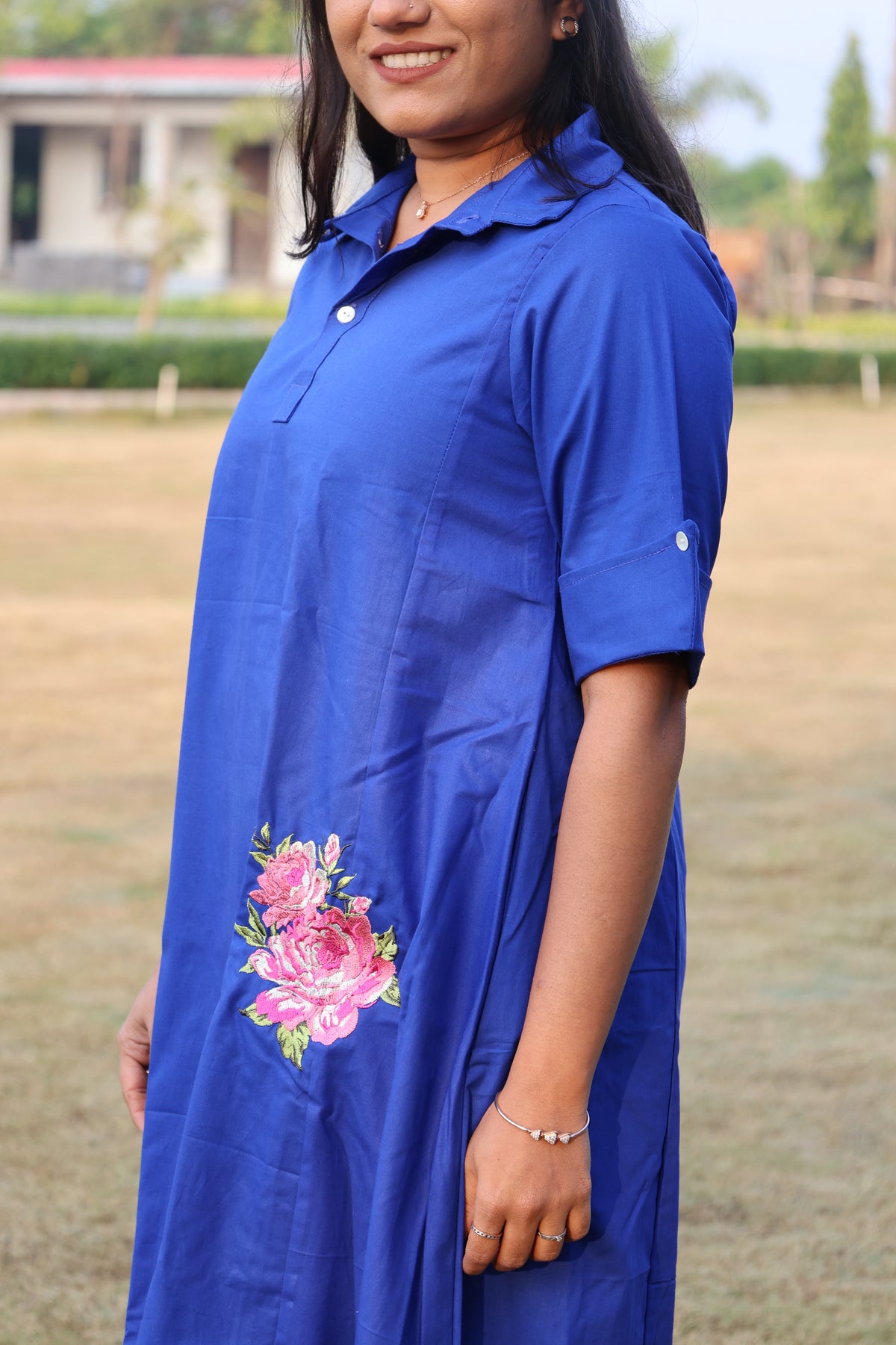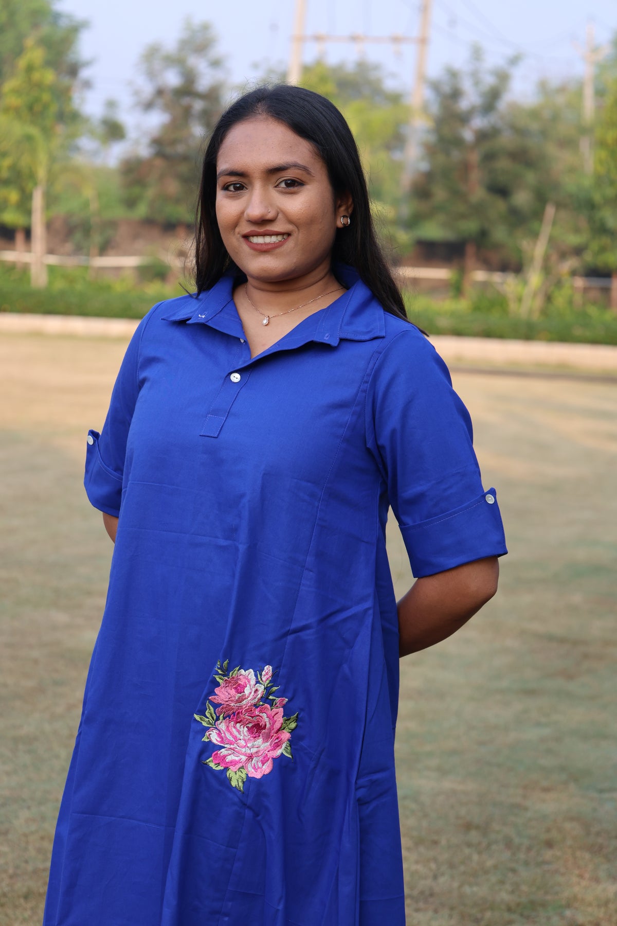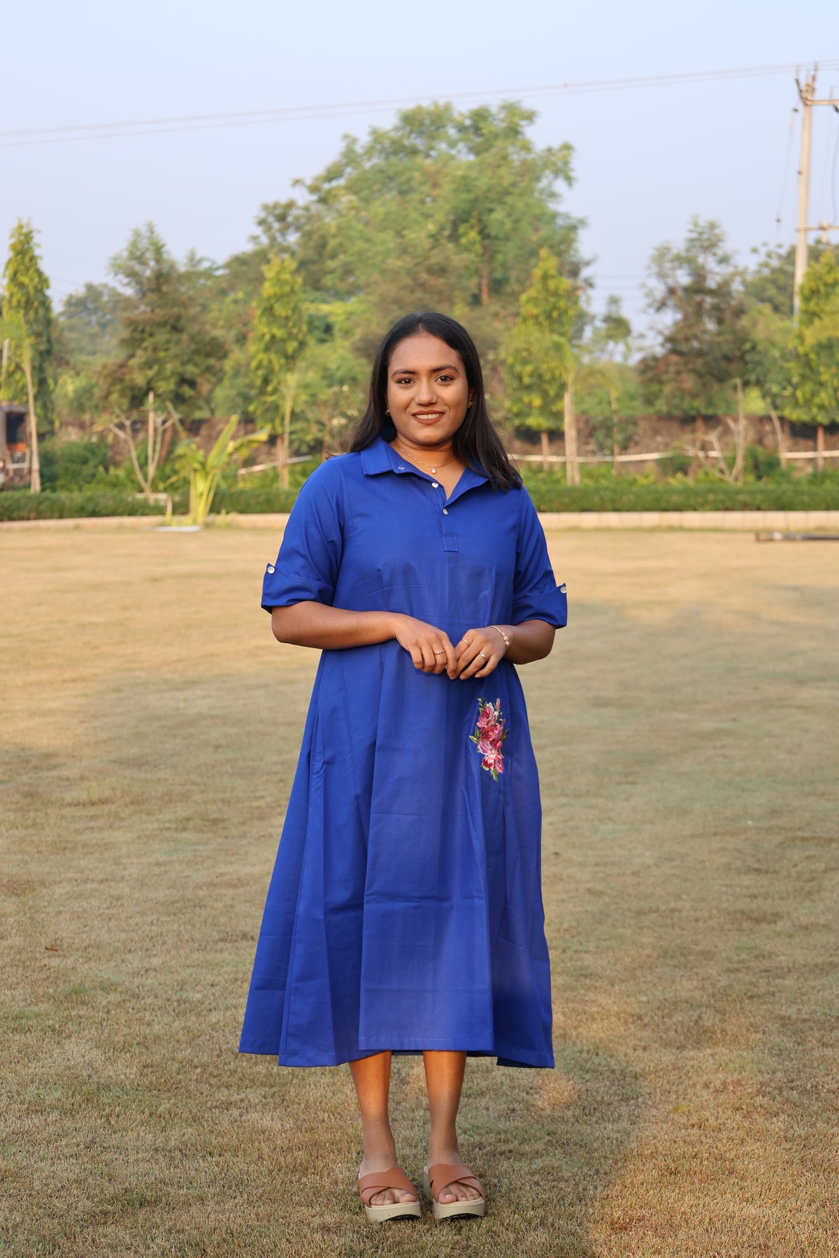 Royal Blue Solid Pure Cotton Dress with Floral Embroidered detailing